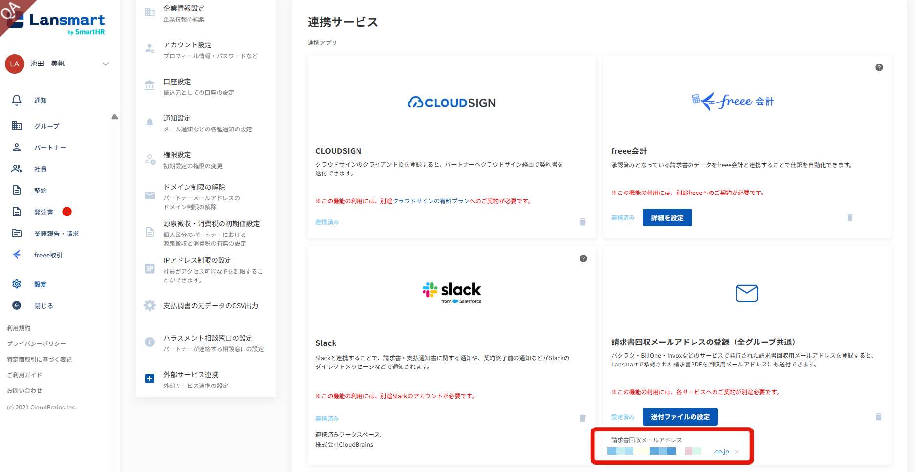 • 左メニュー「設定」をクリックし、「外部サービス連携」を選択。「請求書回収メールアドレスの登録(全グループ共通)」の「未設定」をクリックし、請求書回収メールアドレスを入力し、登録ボタンを押します。設定はこれで完了です。