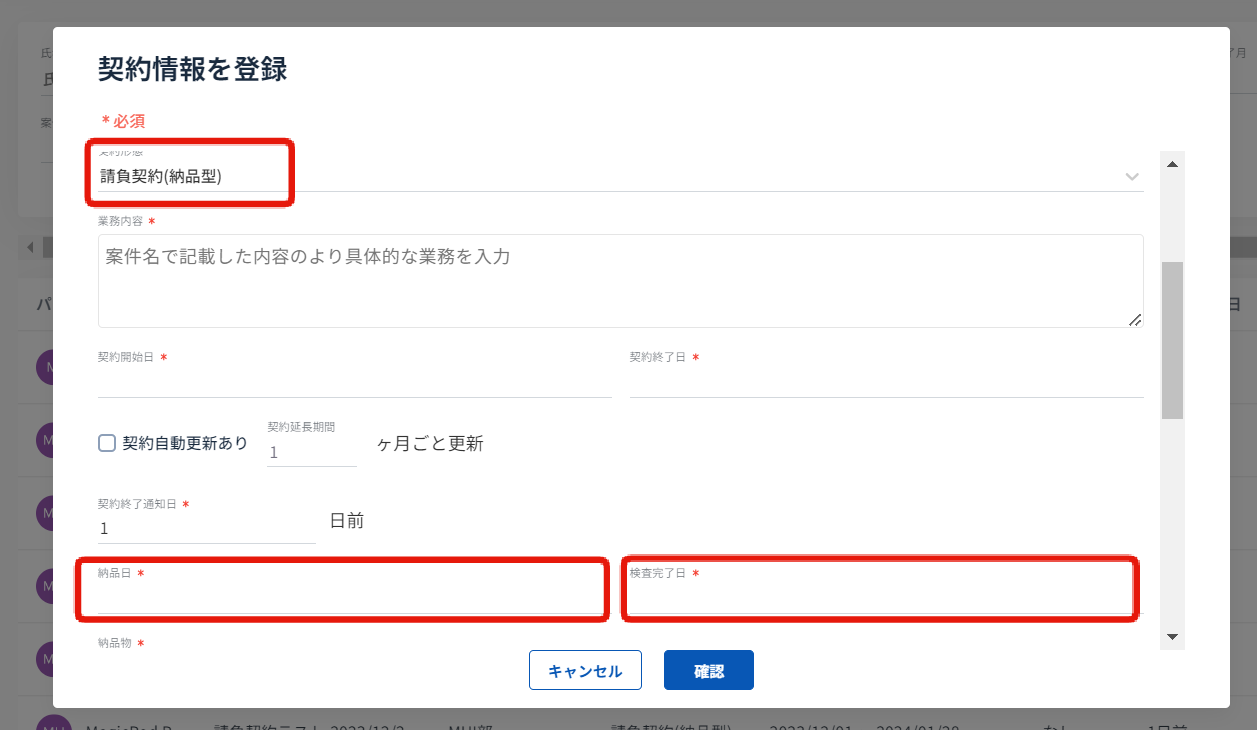 請負契約は、「納品日と検査完了日」ごとに契約を作成してください。 契約期間内に「納品日と検査完了日」が複数発生する場合は、「納品日と検査完了日」ごとに契約の作成をお願いいたします。契約複製機能をご利用いただくと便利です。
