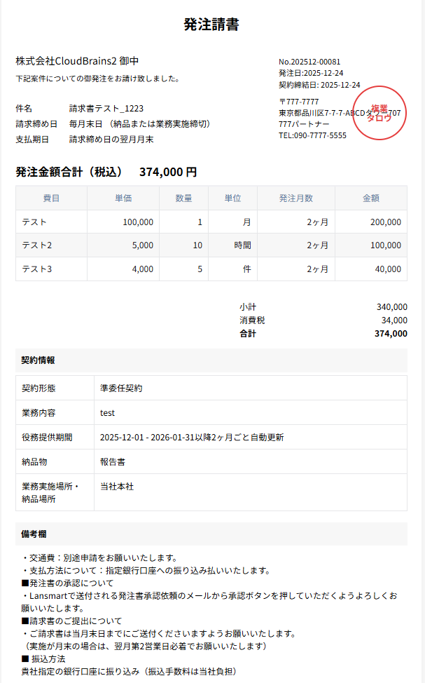 設定した電子印影は、すべての発注請書・請求書に自動的に適用されます。
