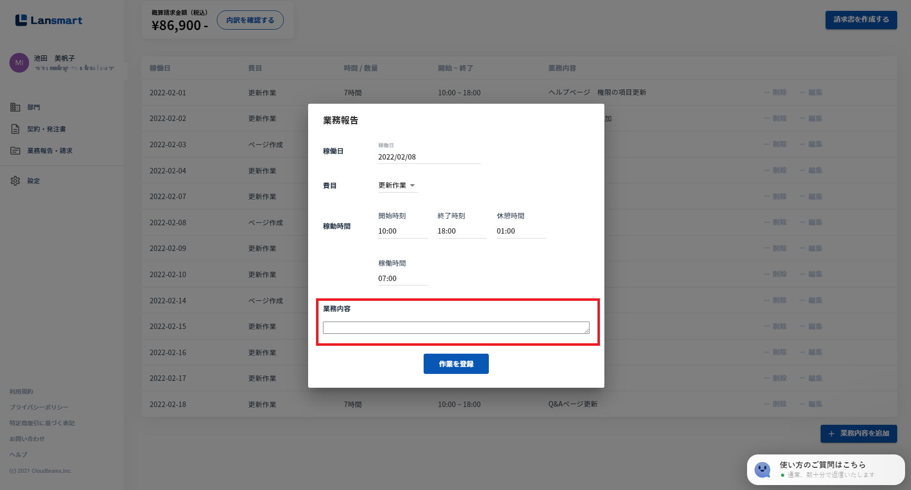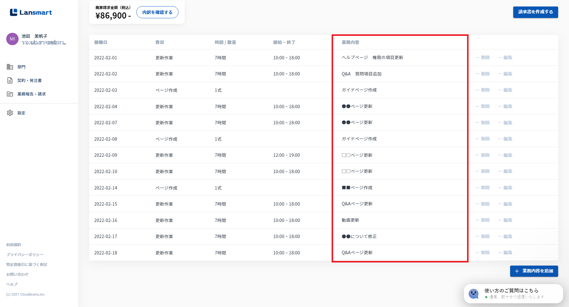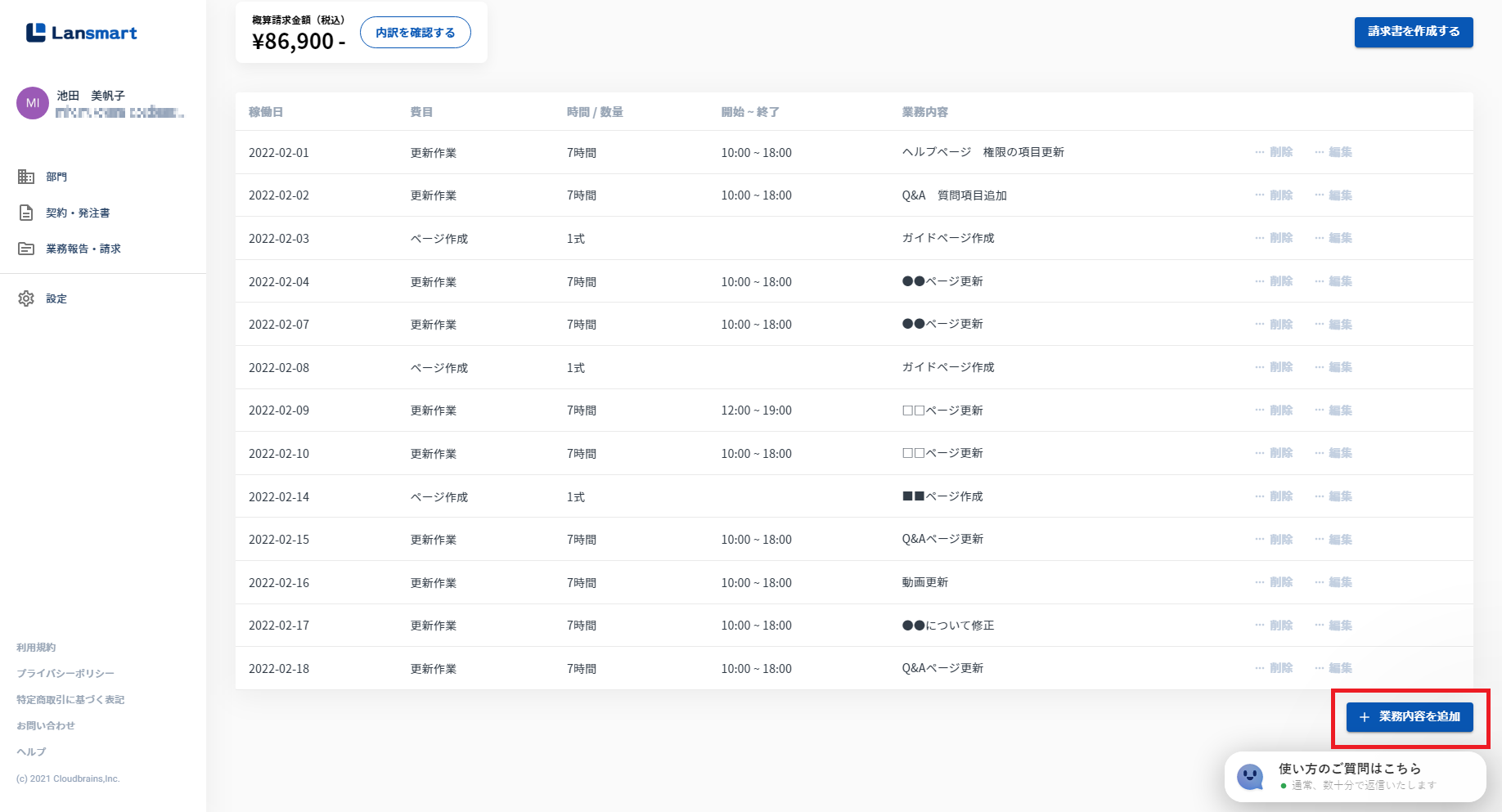 「+業務内容を追加」のボタンが、「チャットでの質問はこちら」のボタンやリストと重ならないように修正しております。