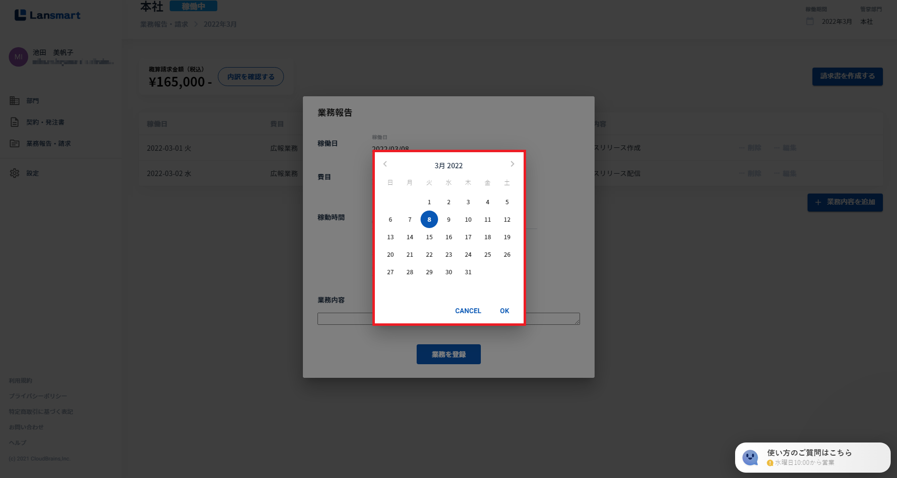 ②業務登録で稼働日を選択するカレンダーが日本語表記になりました。
