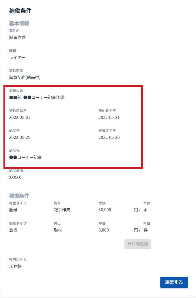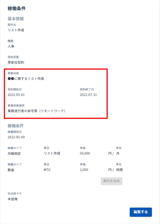 企業様に入力いただく稼働条件も発注書同様に上記の項目が追加されました。(追加された項目は入力必須です。)