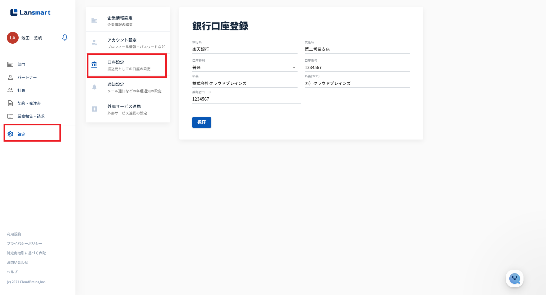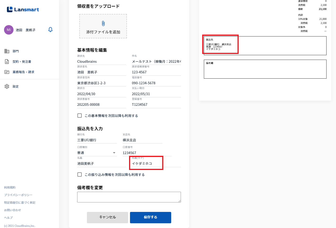 「名義(カナ)」は入力必須項目です。請求書の振込先には、「名義(カナ)」が表示されます。