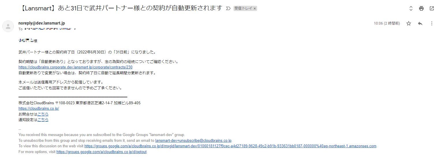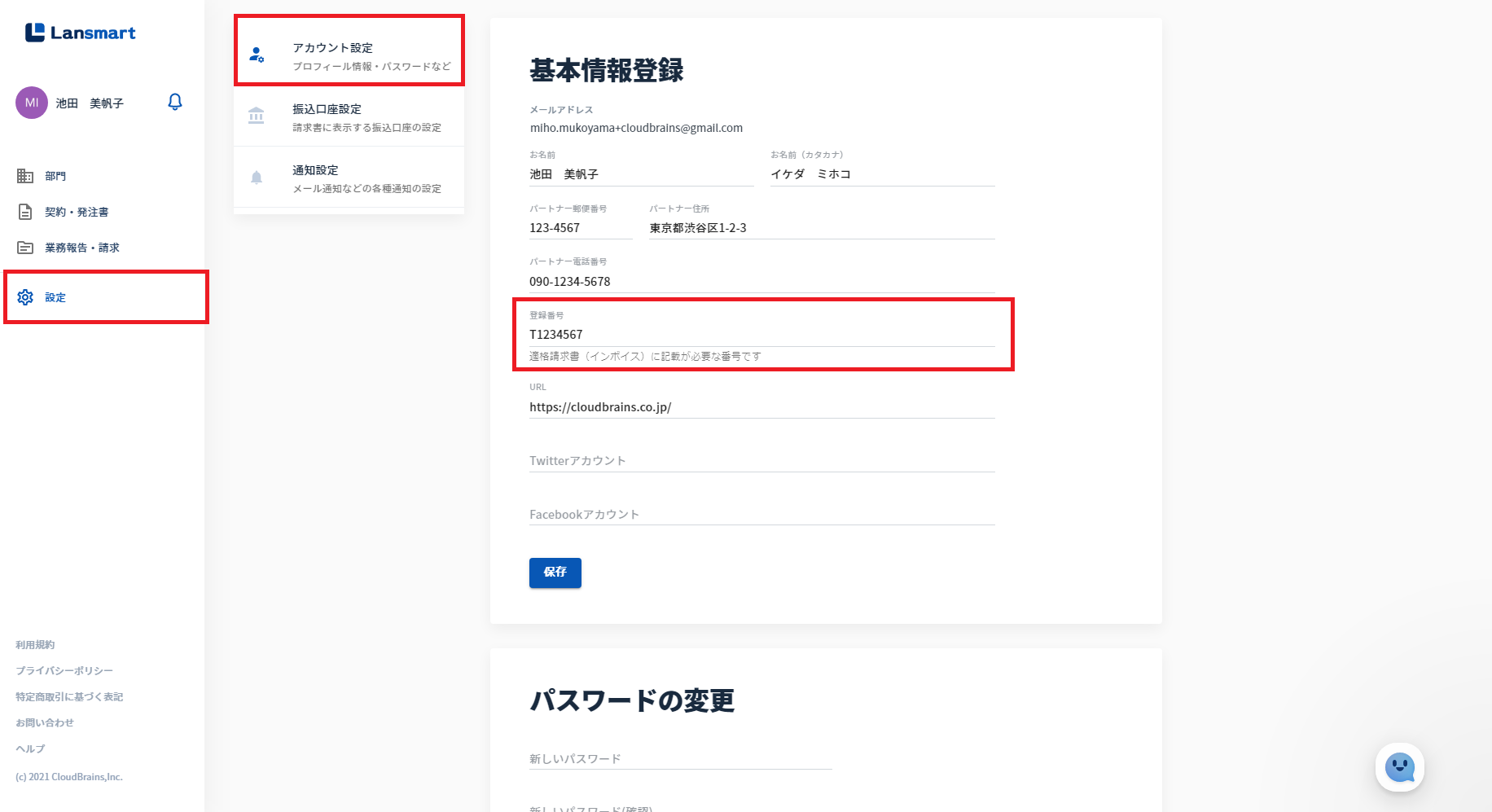 企業様● 基本契約書登録の際に、”自動更新あり”にした場合でも、契約終了日通知が届くようになりました。契約終了日通知は、①Lansmart上の通知②メール通知の両方届きます。その他細かいアップデート● 業務報告・請求一覧画面のレイアウトを調整しました。(1stビューの表示量が多くなるよう、赤枠部分の高さ幅を調整しました)● 適格請求書(インボイス)に記載が必要な登録番号の設定箇所を変更しました。(設定➡アカウント設定)これまで通り、請求書作成画面からでも登録することは可能です。● 細かい不具合修正