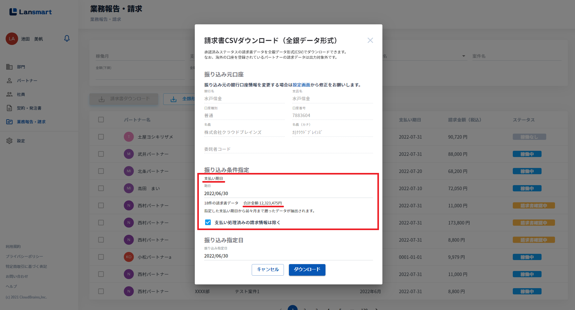 抽出されるデータは、設定した支払い期日から前々月まで遡ったデータです。