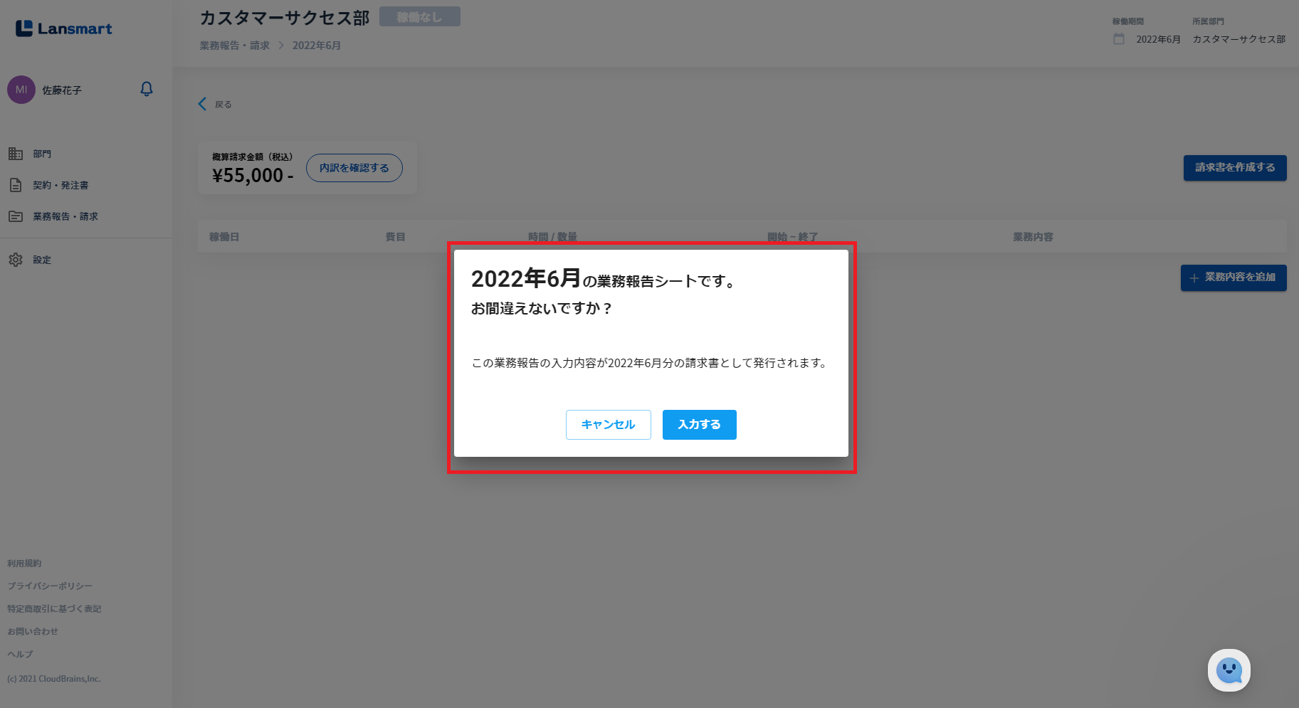 何月の業務報告を登録するのかをよりわかりやすくするため、各月の1件目の業務登録時に確認メッセージが表示されるようになりました。