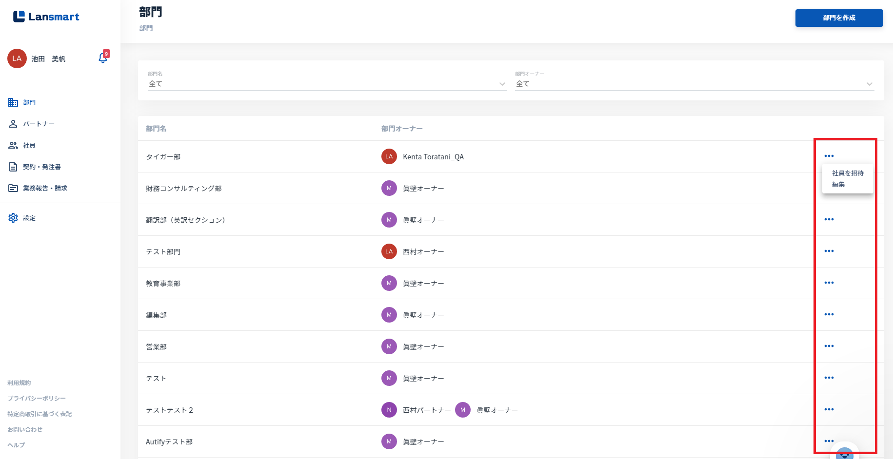 ①左メニュー「部門」の部門オーナー右横 (※企業オーナー・部門オーナーのみ表示されます)