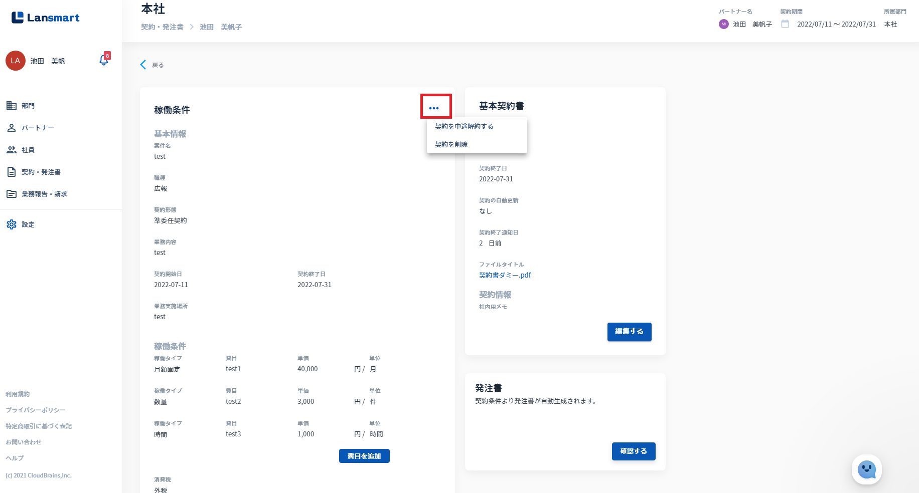 ⑤左メニュー「契約・発注書」の契約詳細画面 稼働条件の右横(※企業オーナー・部門オーナーのみ表示されます)