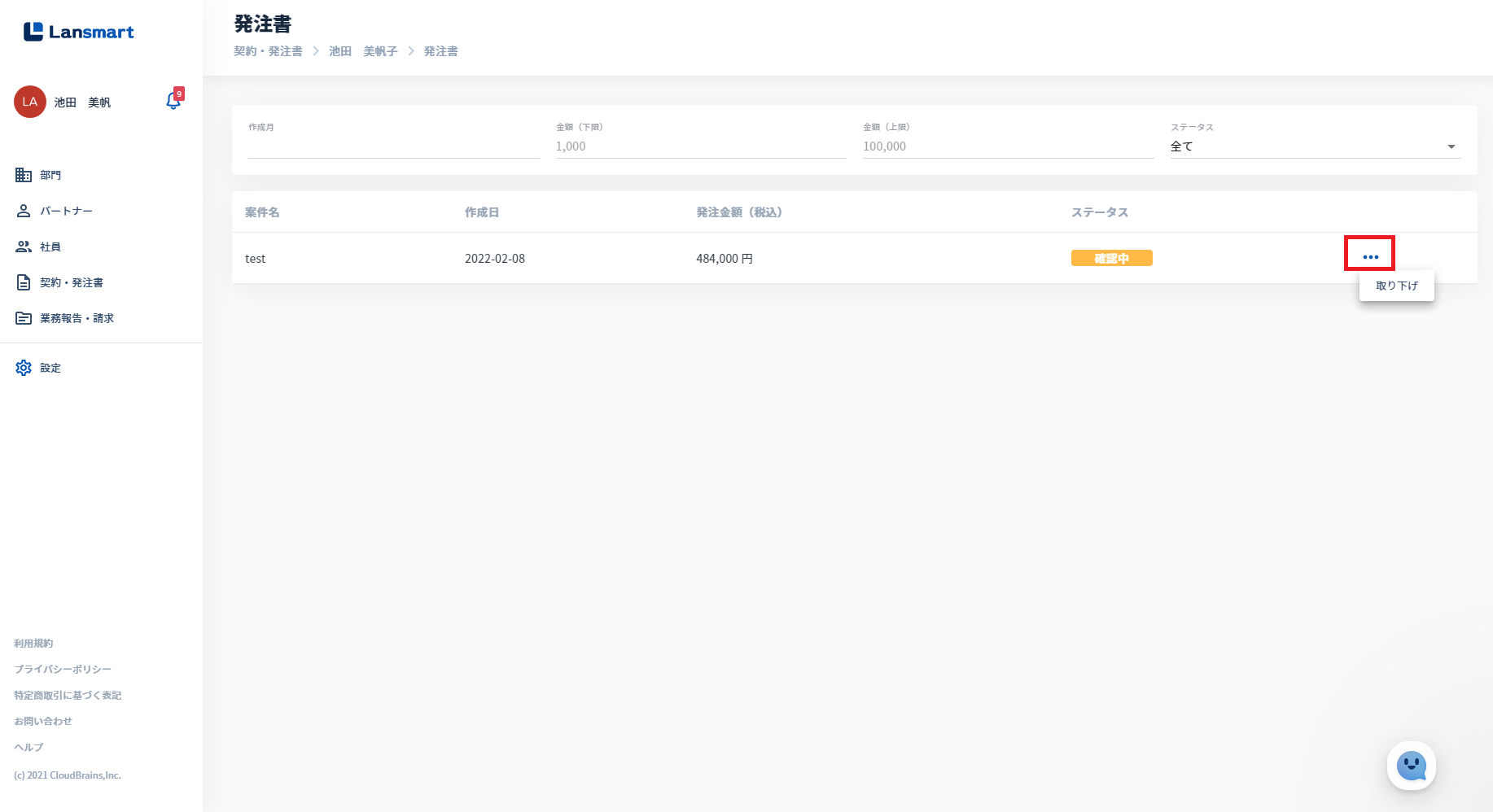 ⑥左メニュー「契約・発注書」→案件名をクリック→発注書の「確認する」をクリック→発注書一覧のステータス右横 (発注書を送付し、パートナー様承認前のステータス(確認中)のみ表示されます) (※企業オーナー・部門オーナーのみ表示されます)