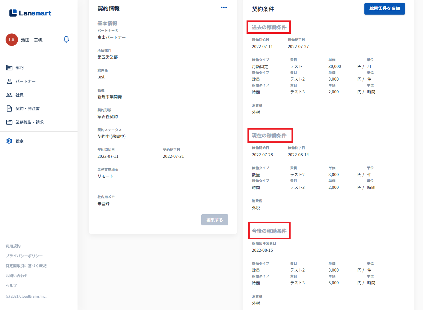 これまでは、契約期間中に稼働条件の費目や単価に変更があった場合、新規で稼働条件を作成いただいていましたが、 今後は同じ契約の中で稼働条件を追加することができるようになりました!