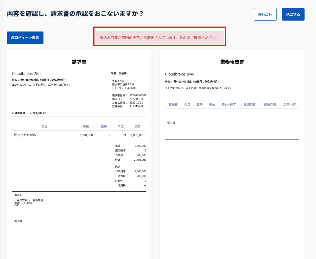 企業様、パートナー様共通● パートナー様の振込先の銀行口座が前月の請求書と異なる場合、確認画面にメッセージが表示されるようになりました経理ご担当者様は、ご活用くださいませ。確認メッセージは請求書承認後も表示されます。 尚、確認メッセージが表示されるのは、同一の契約で前月の請求書と異なる場合のみです。異なる契約の場合は表示されません。その他細かいアップデート● その他細かい不具合修正