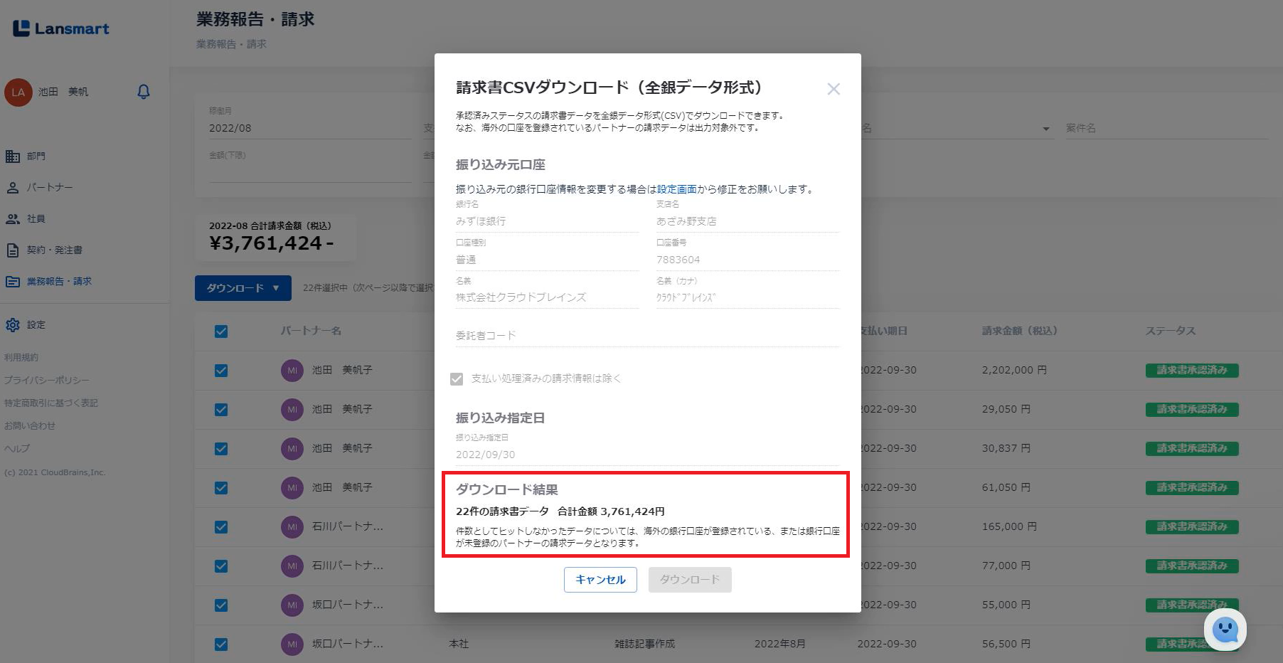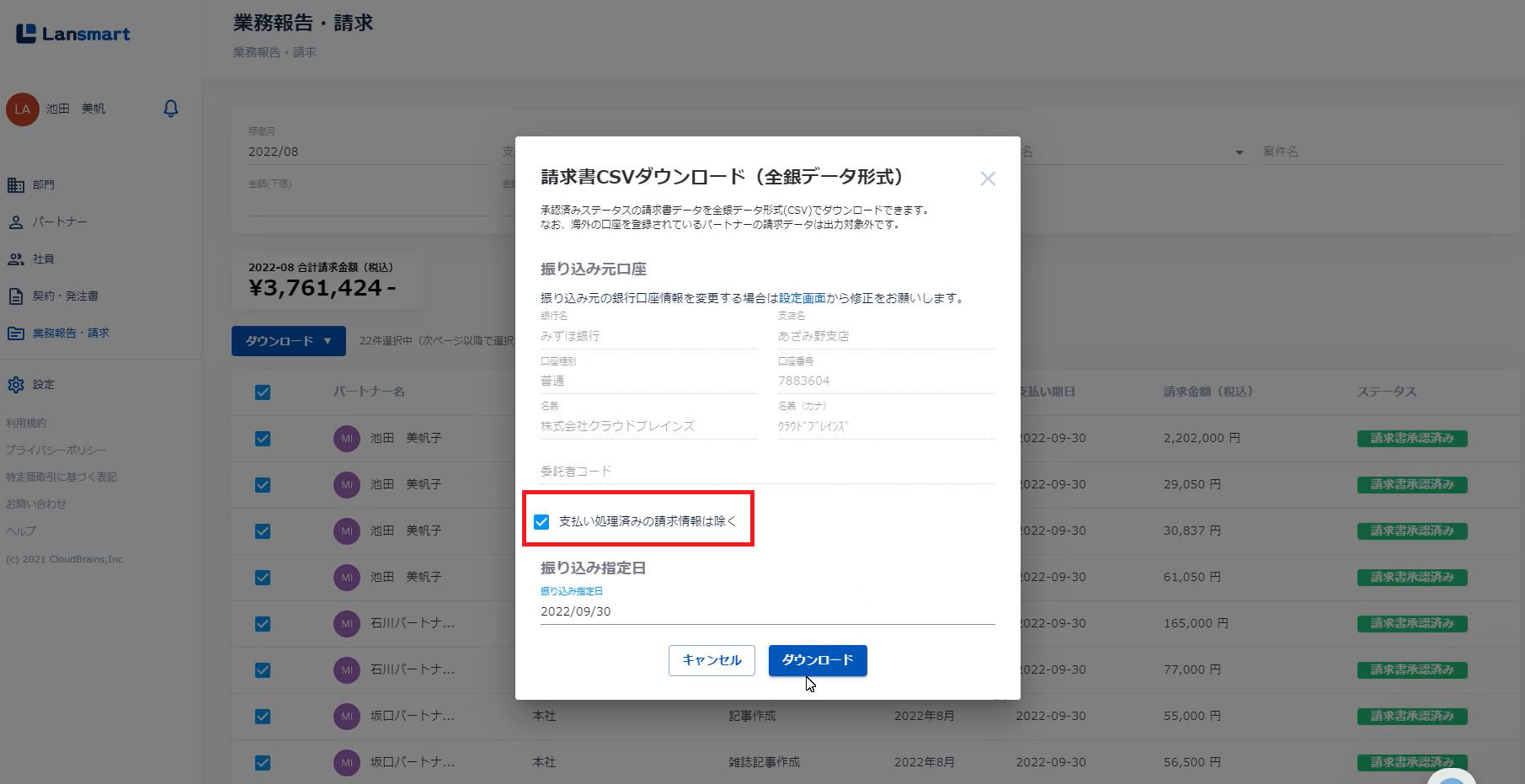 ☑すると、一覧に表示されている全ての承認済み請求書を一括ダウンロードすることができます。