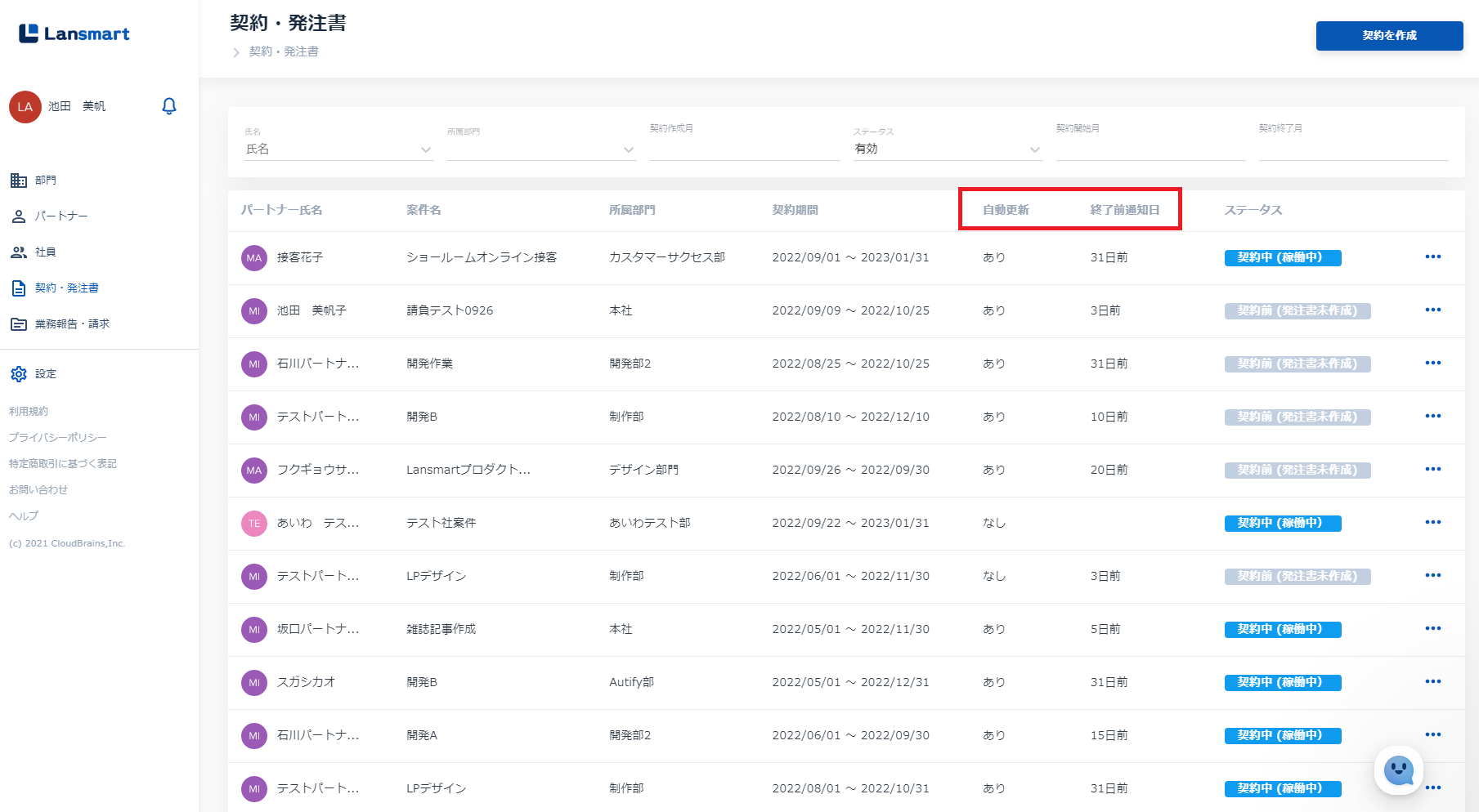 「パートナー」「部門」「契約開始日」「契約終了日」(請負契約の場合は「納品日」「検査完了日」も)を入力し、「登録」ボタンを押すと完了です。