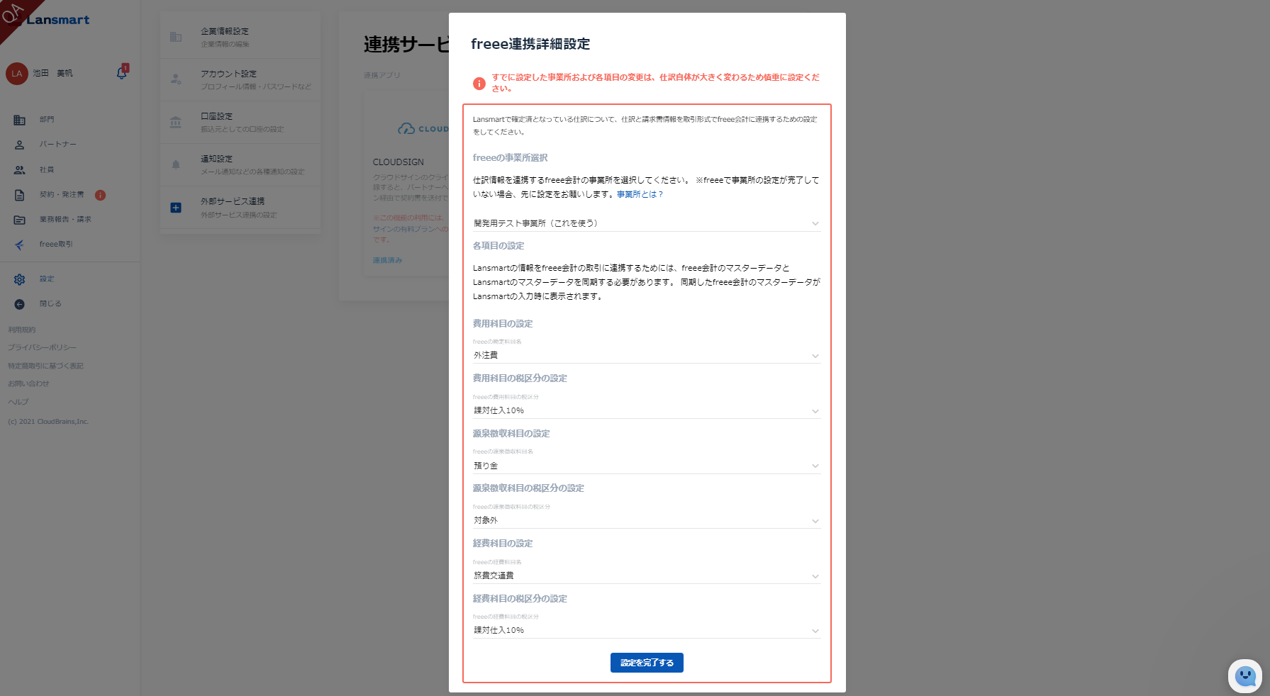 同期したfreee会計のマスターデータがLansmartの入力時に表示されます。 「費用科目の設定(freeeの勘定科目名)」、「費用科目の税区分の設定(freeeの費用科目の税区分)」、「源泉徴収科目の設定(freeeの源泉徴収科目名)」、「源泉徴収科目の税区分の設定(freeeの源泉徴収科目の税区分)」、「経費科目の設定(freeeの経費科目名)」、「経費科目の税区分の設定(freeeの経費科目の税区分)」についてプルダウンから選択肢してください。(全ての項目を選択してください。)