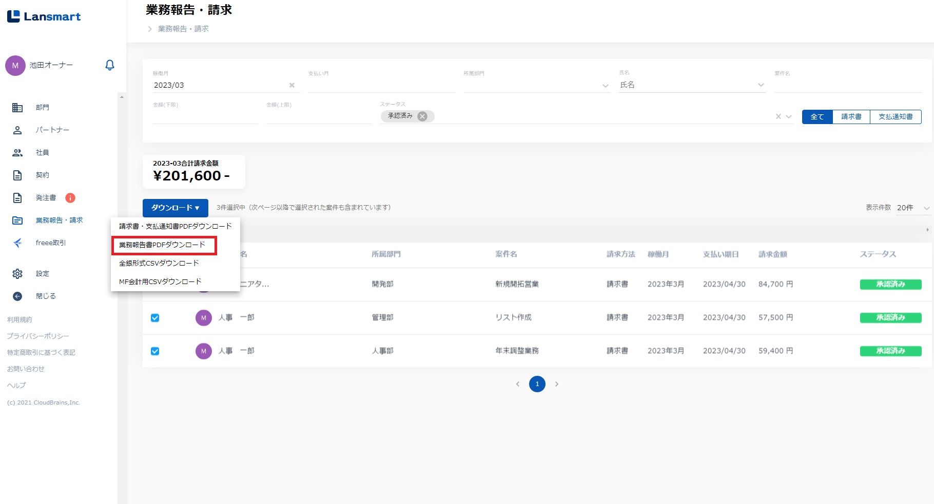 業務報告書がダウンロードできる請求書は、「承認済み」「支払処理済み」ステータスの請求書です。