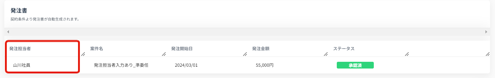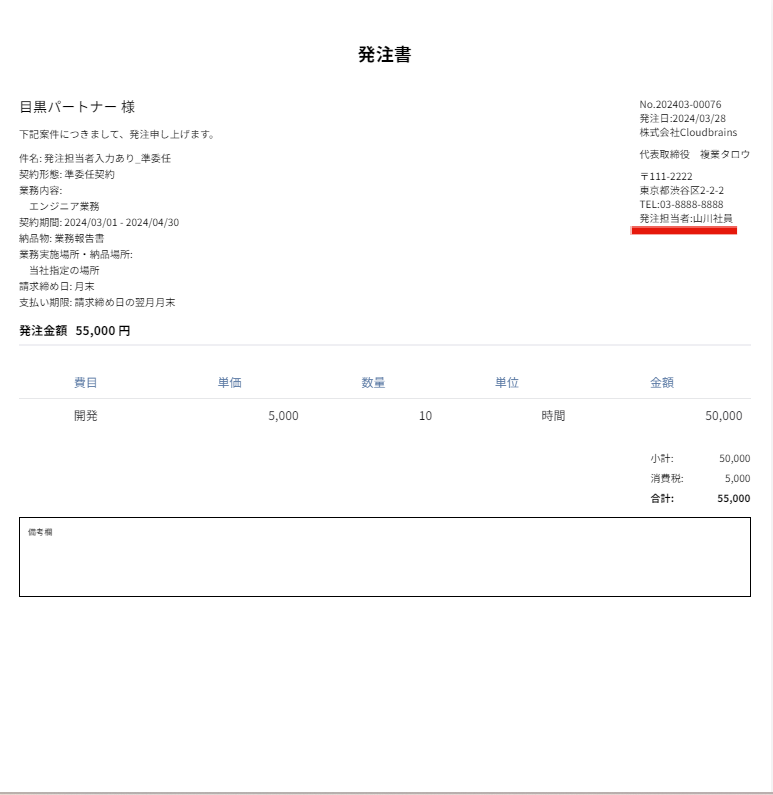 📍発注担当者を入力した場合の発注書