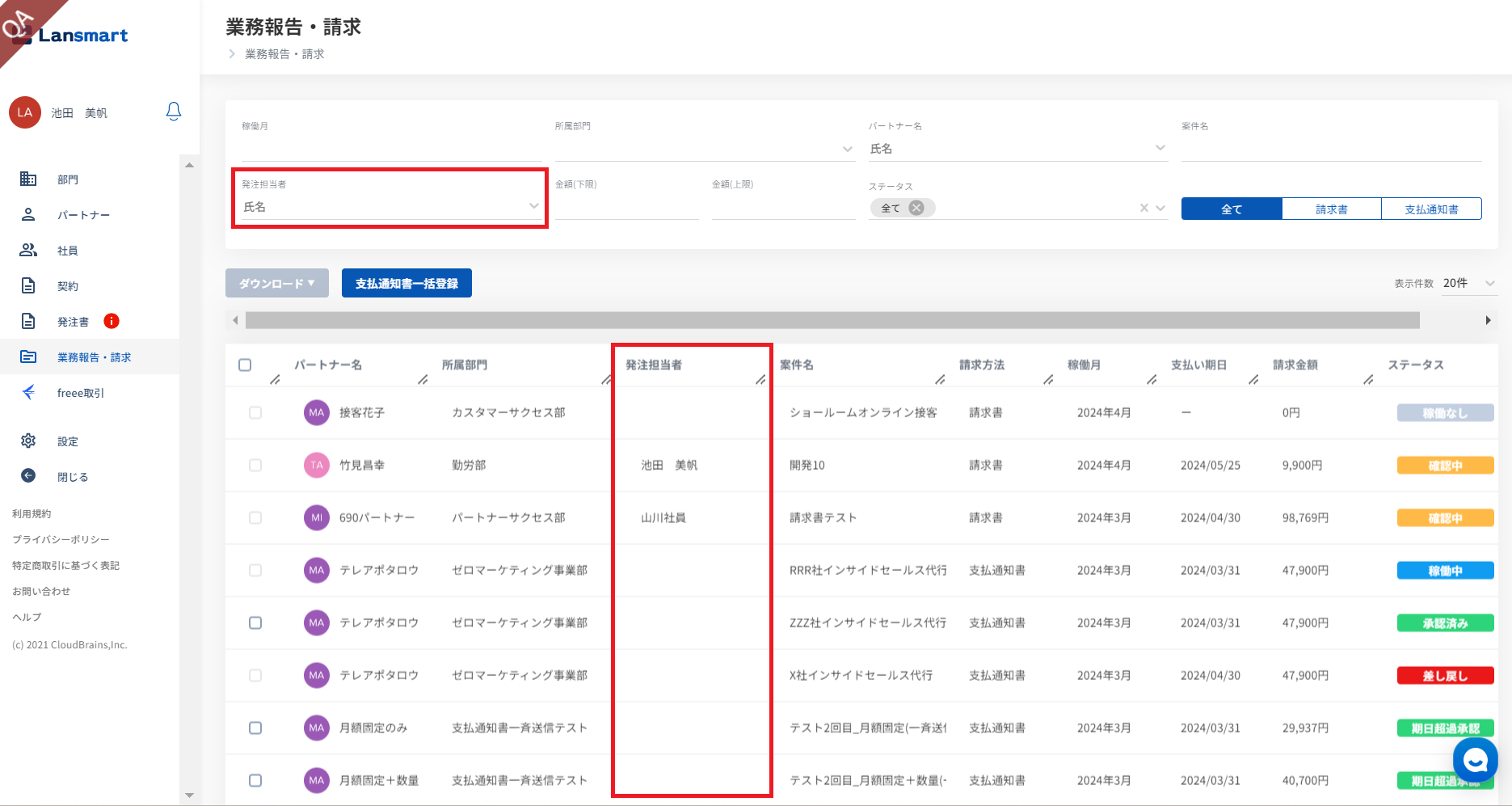 発注書一覧、業務報告請求一覧にも「発注担当者」が表示されます。フィルタをかけることもできます。