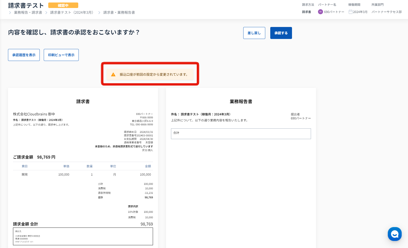 確認メッセージは請求書/支払通知書承認後も表示されます。