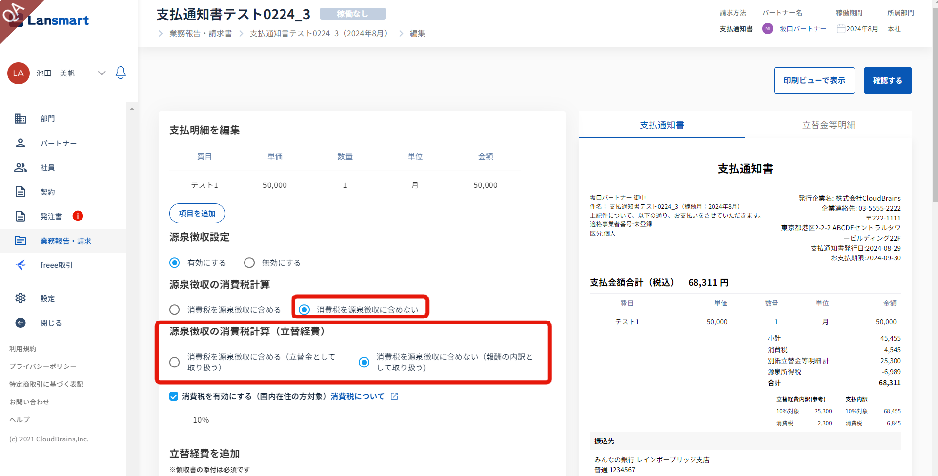 今回のリリースにより、「消費税を源泉徴収に含めない」(特例)を選択した場合は、立替経費について「報酬の内訳として取り扱うこと」の選択が可能となりました。