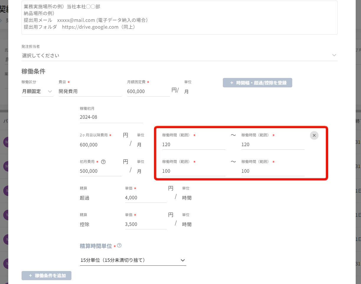 契約情報を稼働条件の下部に表示し、罫線を入れ見やすいUIに改善しました。