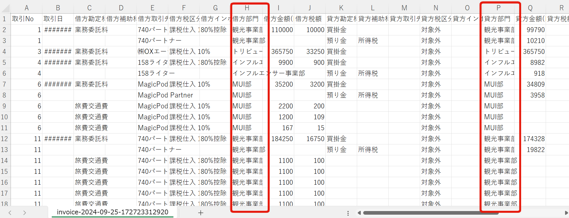借方部門、貸方部門の列に「部門名」が表示されるようになりました
