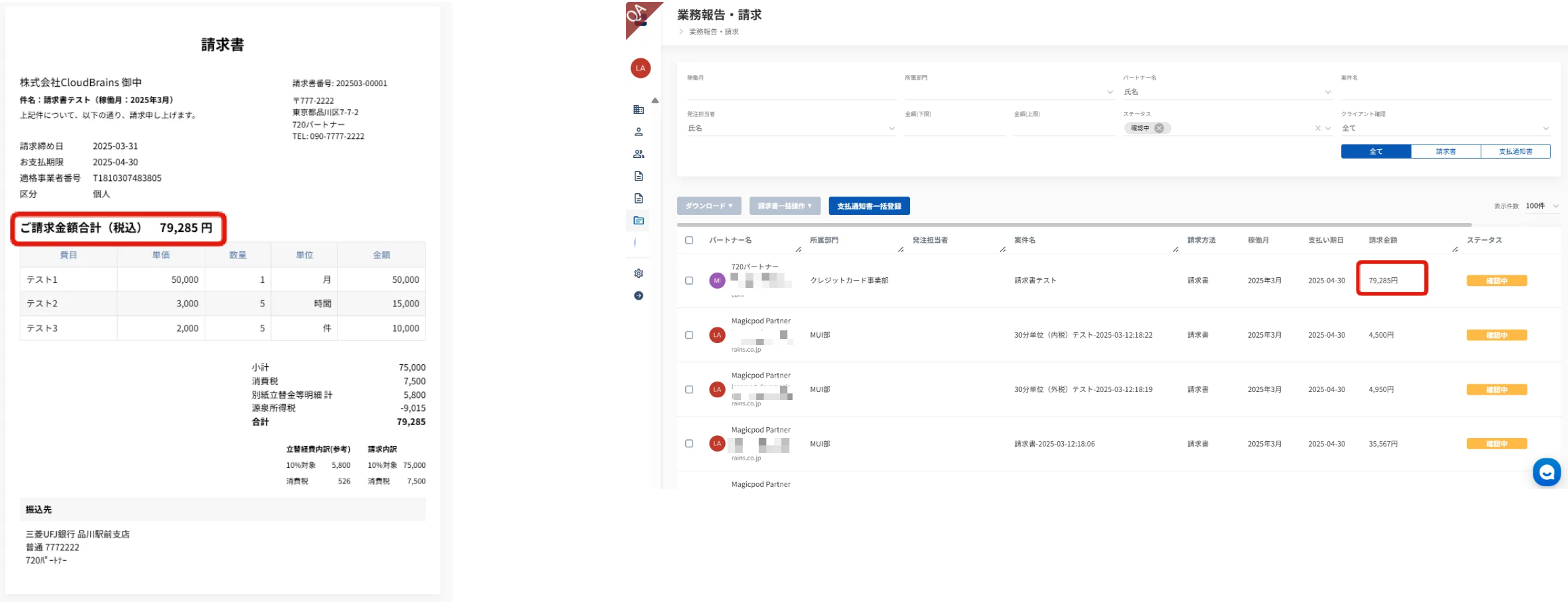 業務報告・請求一覧に表示される請求金額は、請求書/支払通知書作成時の金額が表示されます。(立替経費・交通費・請求項目を追加、源泉所得税を含みます)