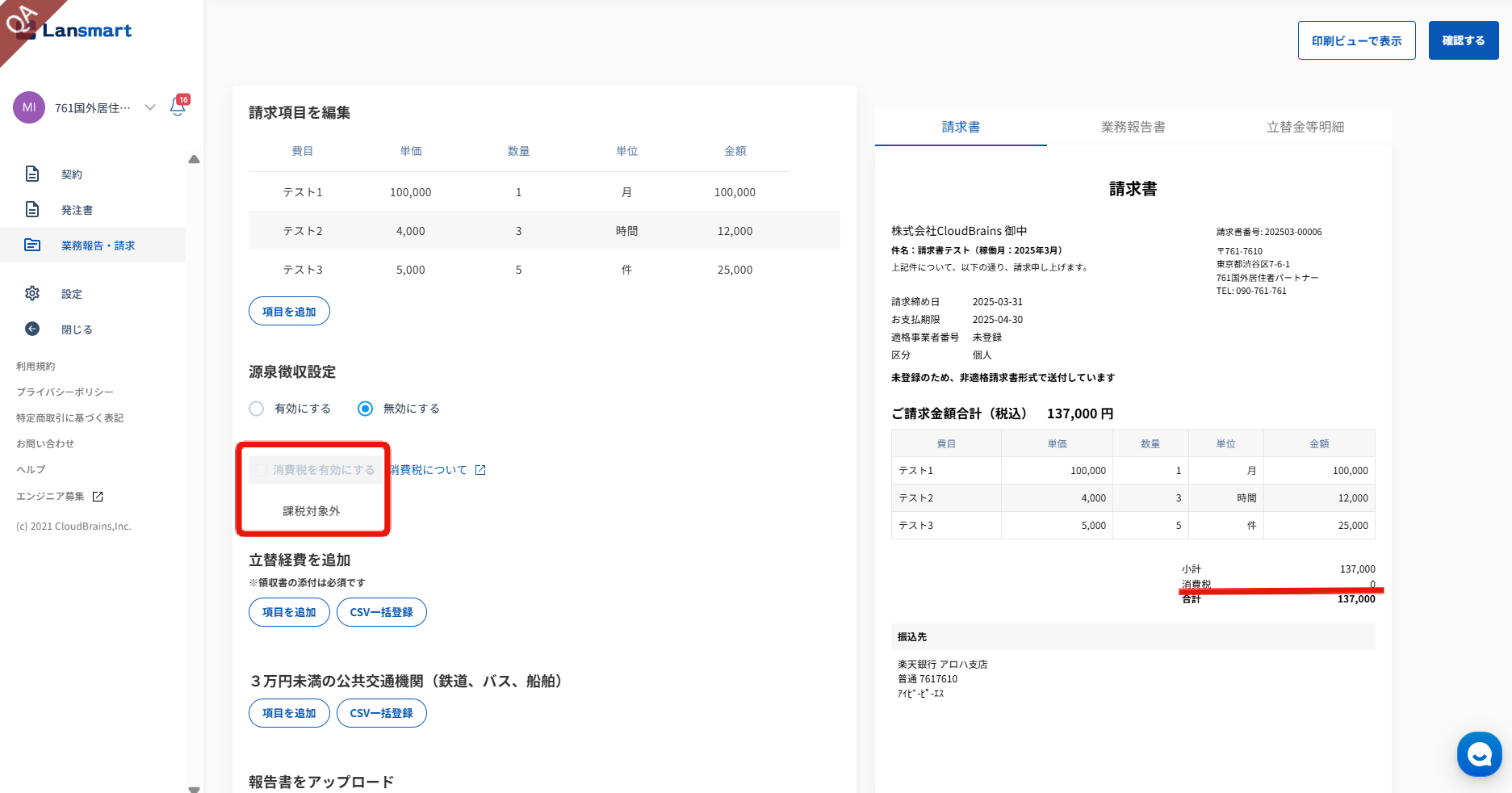 Lansmart上で「国外居住者かつ国外での役務提供」について「該当する」として登録している場合は、日本における消費税の対象外となる取引に該当しますので、「請求書/支払通知書」の作成画面では自動的に「消費税を有効にする」の☑が外れ、課税対象外として発行されるようになりました。