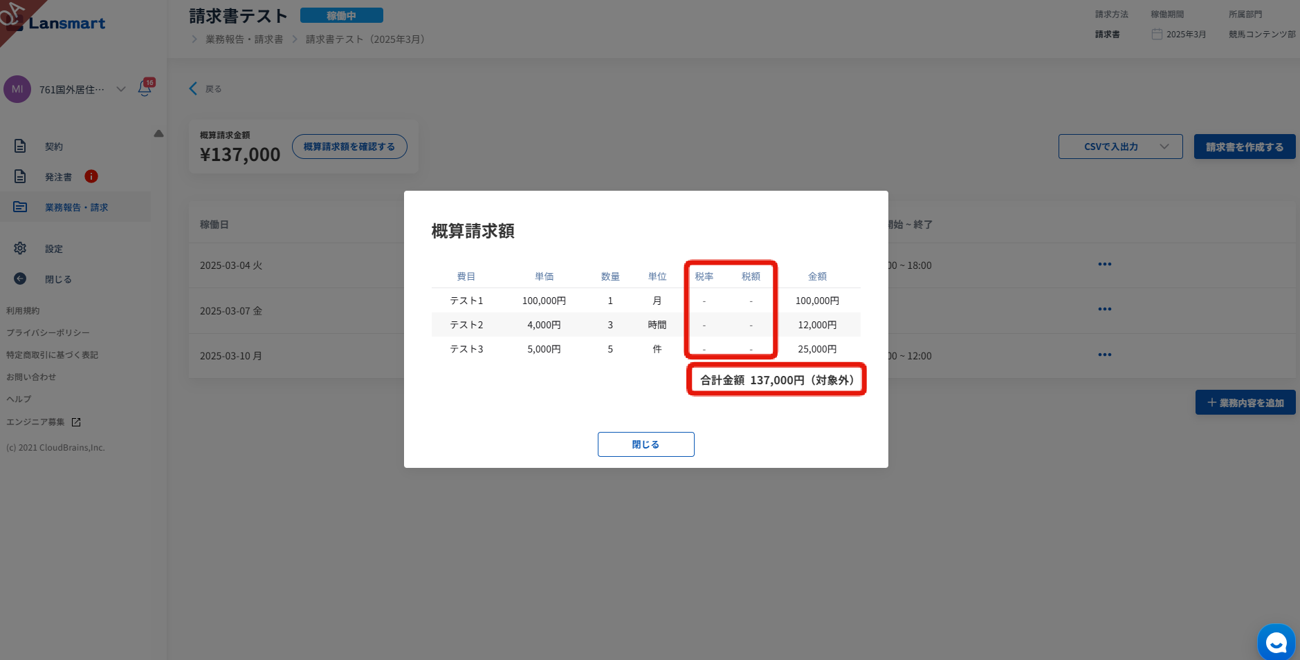 概算請求金額のモーダルについても、税率・税額は非表示となります。