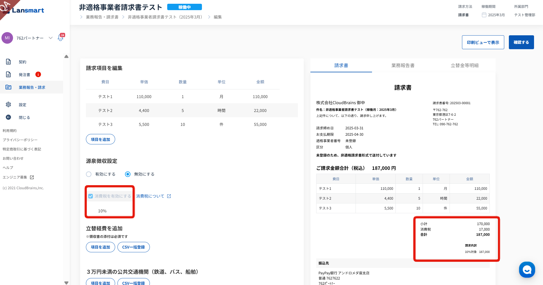 パートナー様がLansmartへ登録した内容により適格請求書発行事業者であるかを自動判定し、適格請求書発行事業者の場合は「適格請求書」、その他の場合は「区分記載請求書」での発行を行う機能です。