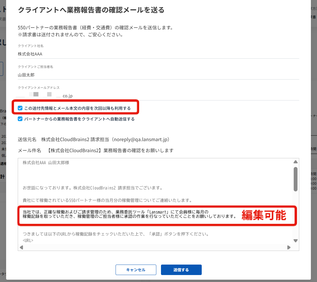 ※契約詳細の画面から設定するモーダルには、「この送付先情報とメール本文の内容を次回以降も利用する」の☑はありませんが、メール本文を編集した場合、内容は保存されます。