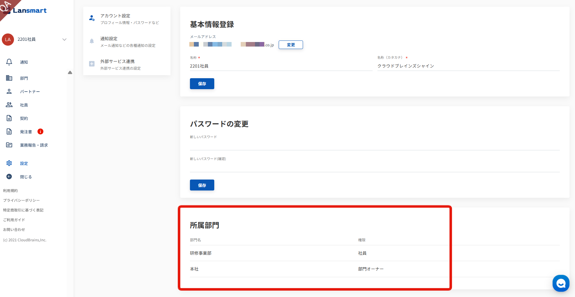 パートナー様:左メニュー「設定」→「アカウント設定」の基本情報登録画面