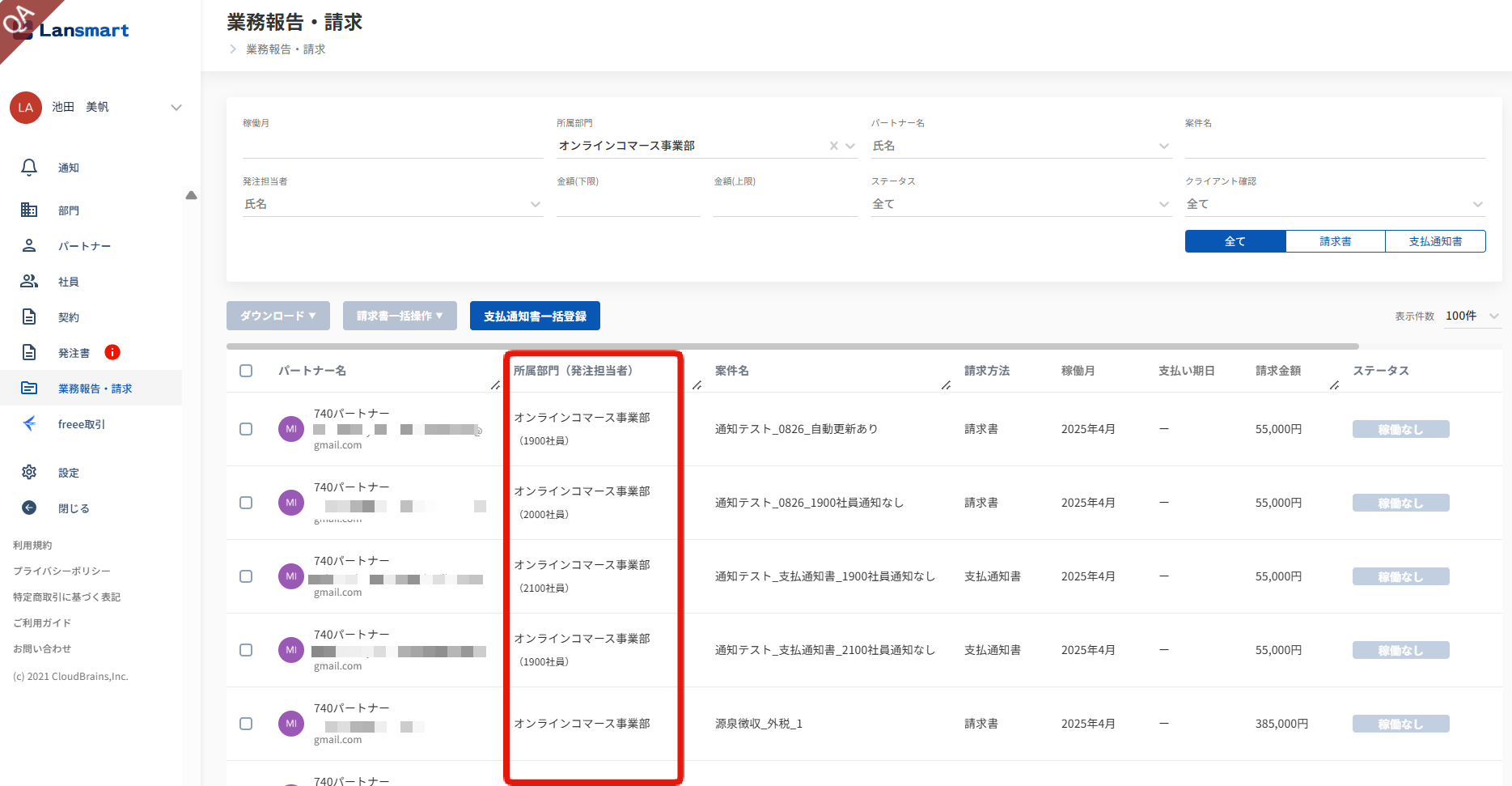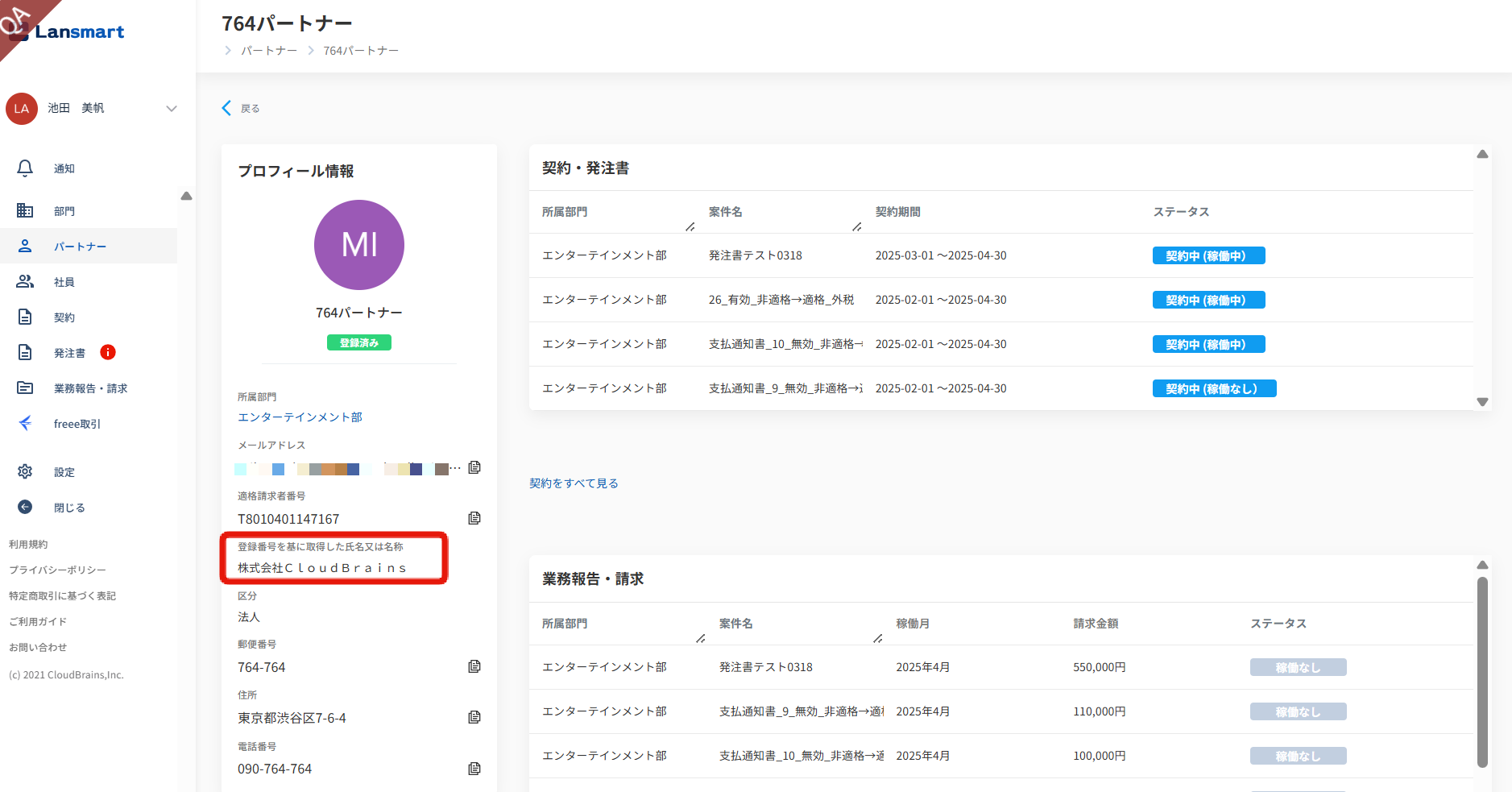 企業様は、各パートナーのプロフィール情報画面にて「登録番号を基に取得した氏名又は名称」を確認いただくことができます。