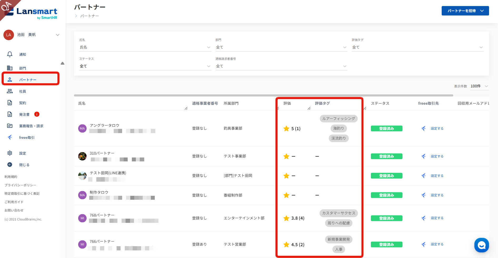 企業様側のパートナー一覧画面にて、パートナーの評価点、評価タグが表示されます。