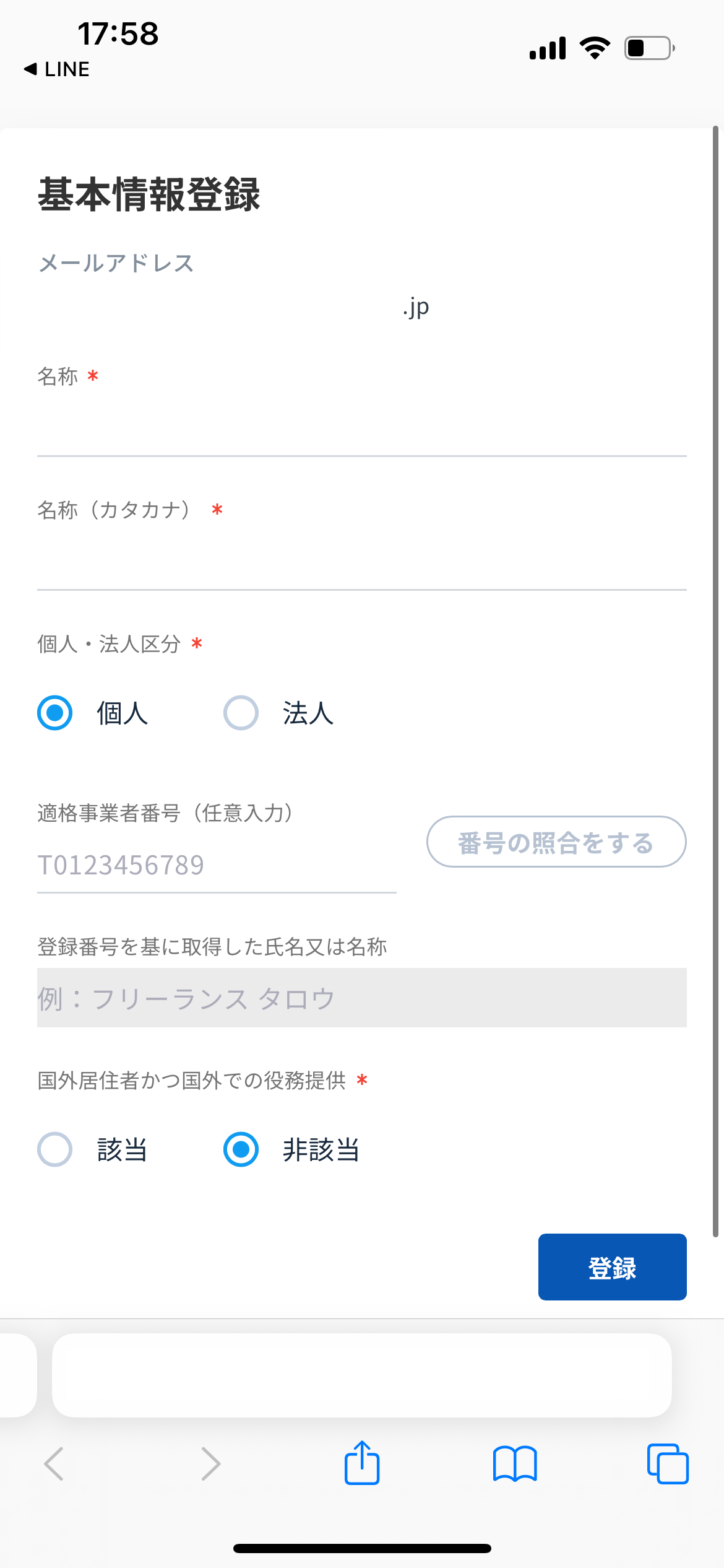 ⑤ 基本情報登録画面に遷移しますので、必要事項を入力し、「登録」ボタンを押してください。