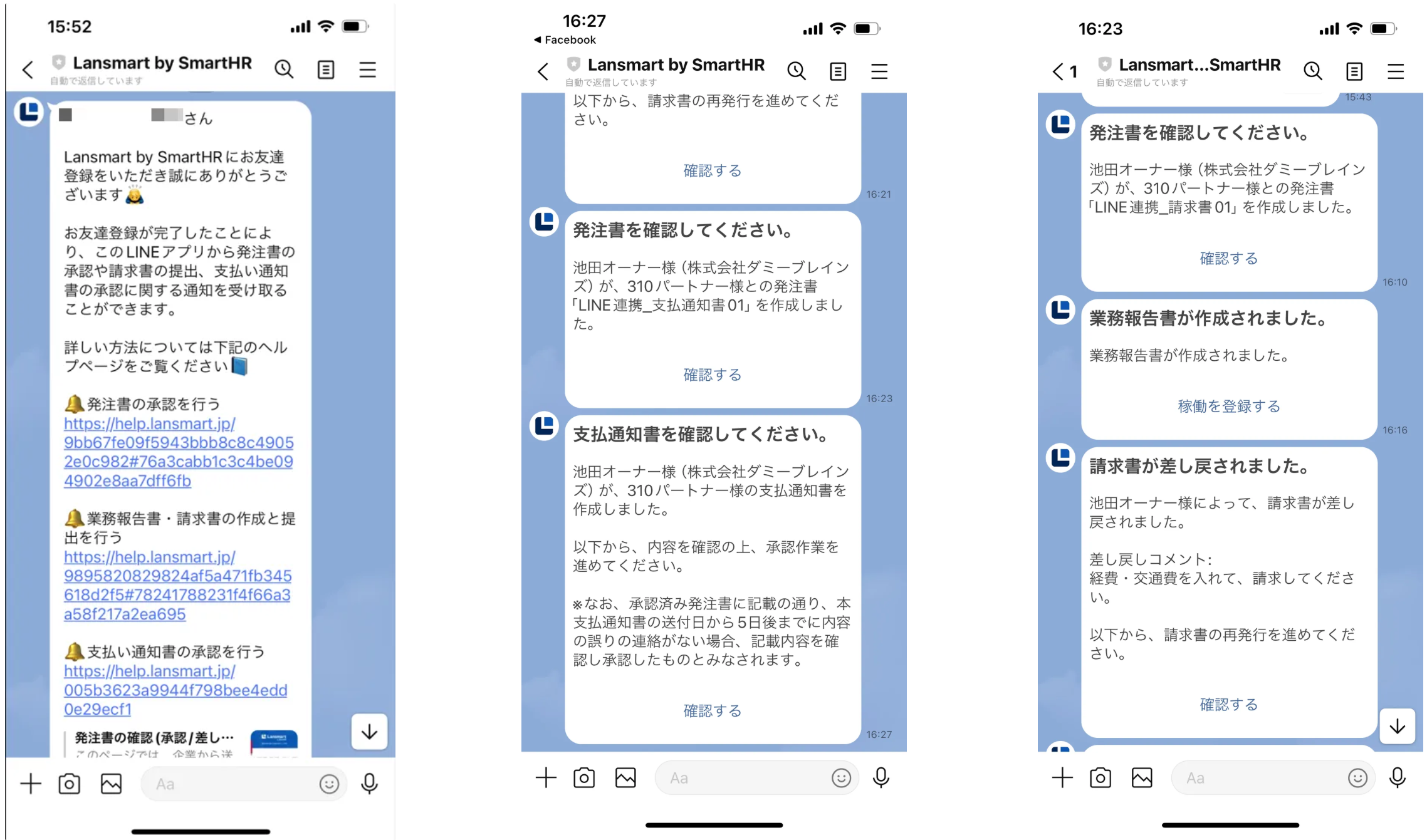 LINEソーシャルログインで連携を行うことで、発注書の承認依頼・請求書作成のリマインド、請求書が差し戻された際の再提出依頼、支払通知書の承認依頼がLINEで通知されます。
