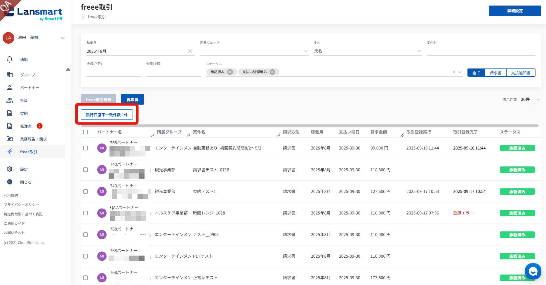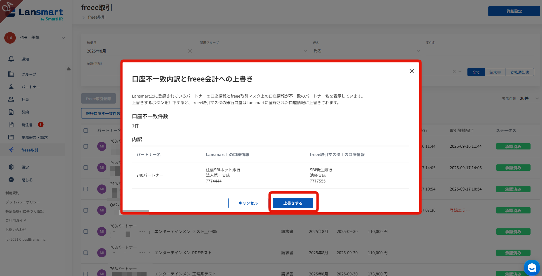 パートナー一覧にてfreee取引先を設定しているパートナーの請求書/支払通知書をfreee会計と連携する場合、freee会計の取引先として登録されている口座情報とLansmartで登録されている口座情報が一致しない場合はそれを検知します。