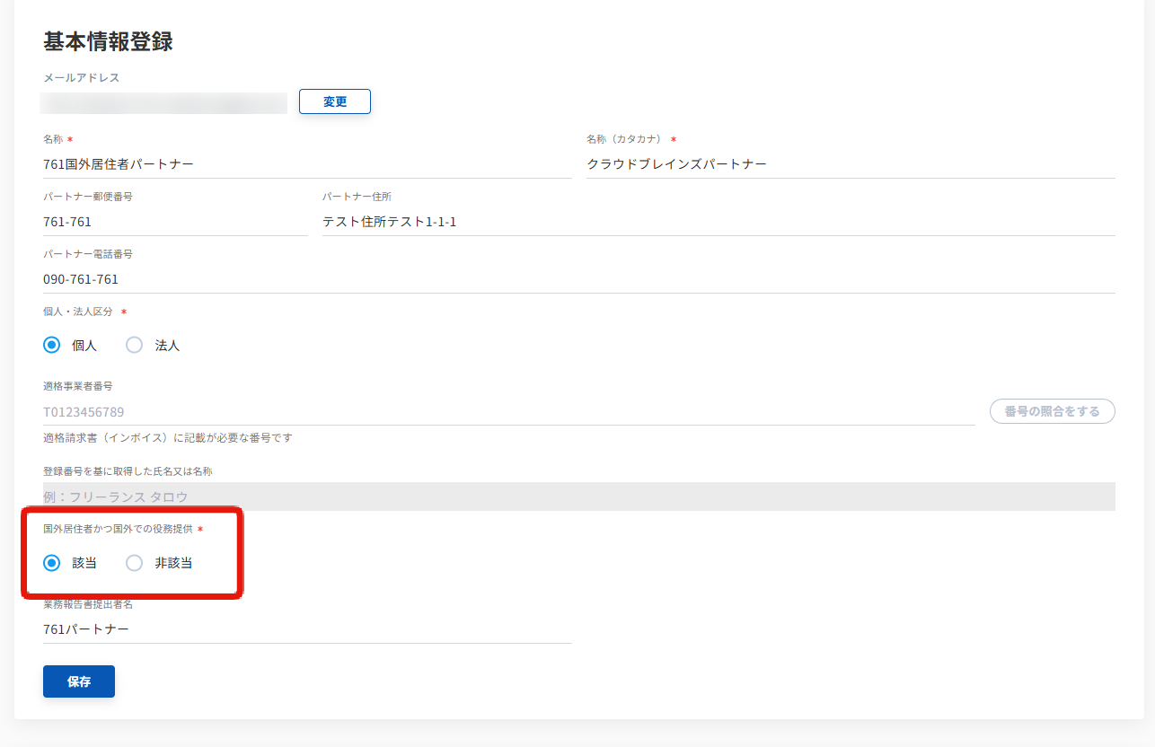 (「国外居住者かつ国外での役務提供」が非該当のパートナーの契約では、「対象外」は選択できません。)