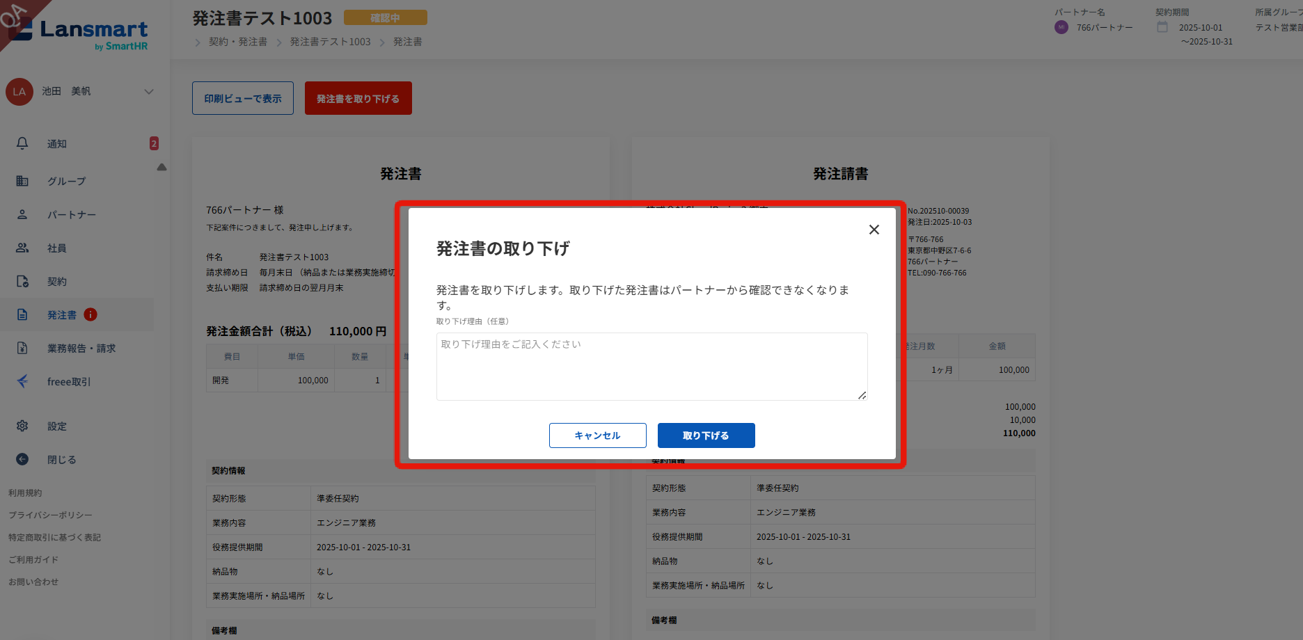 「発注書を取り下げる」ボタンを押すとモーダルが開き、取り下げ理由を入力できます。