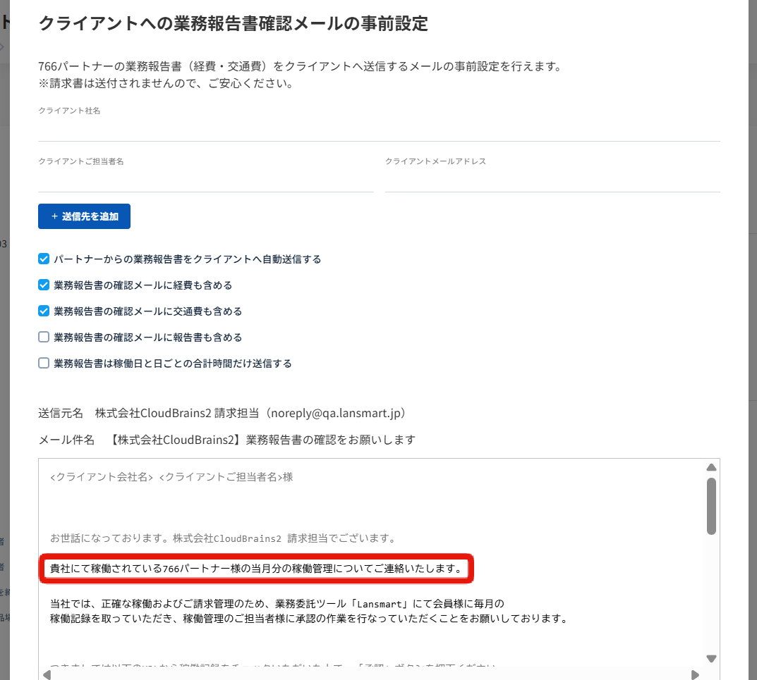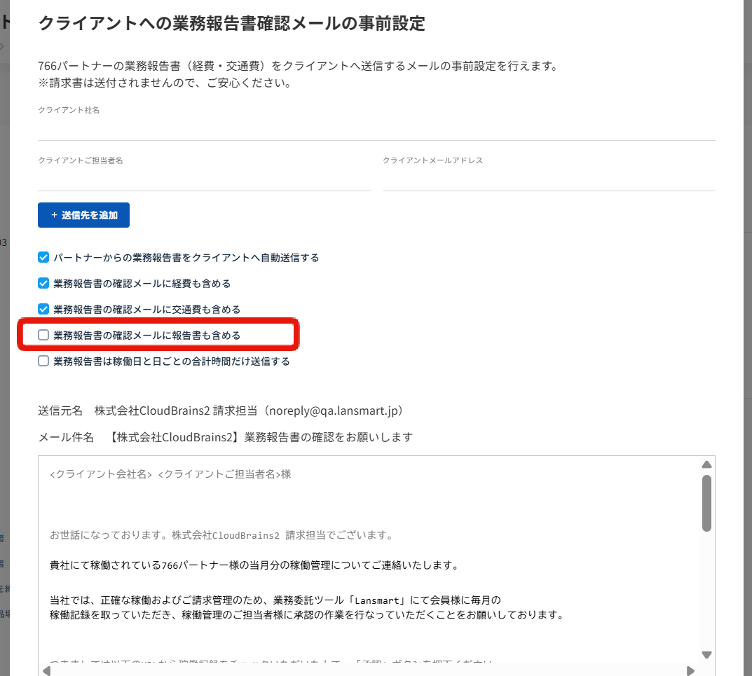クライアントへの業務報告書確認メールの設定画面