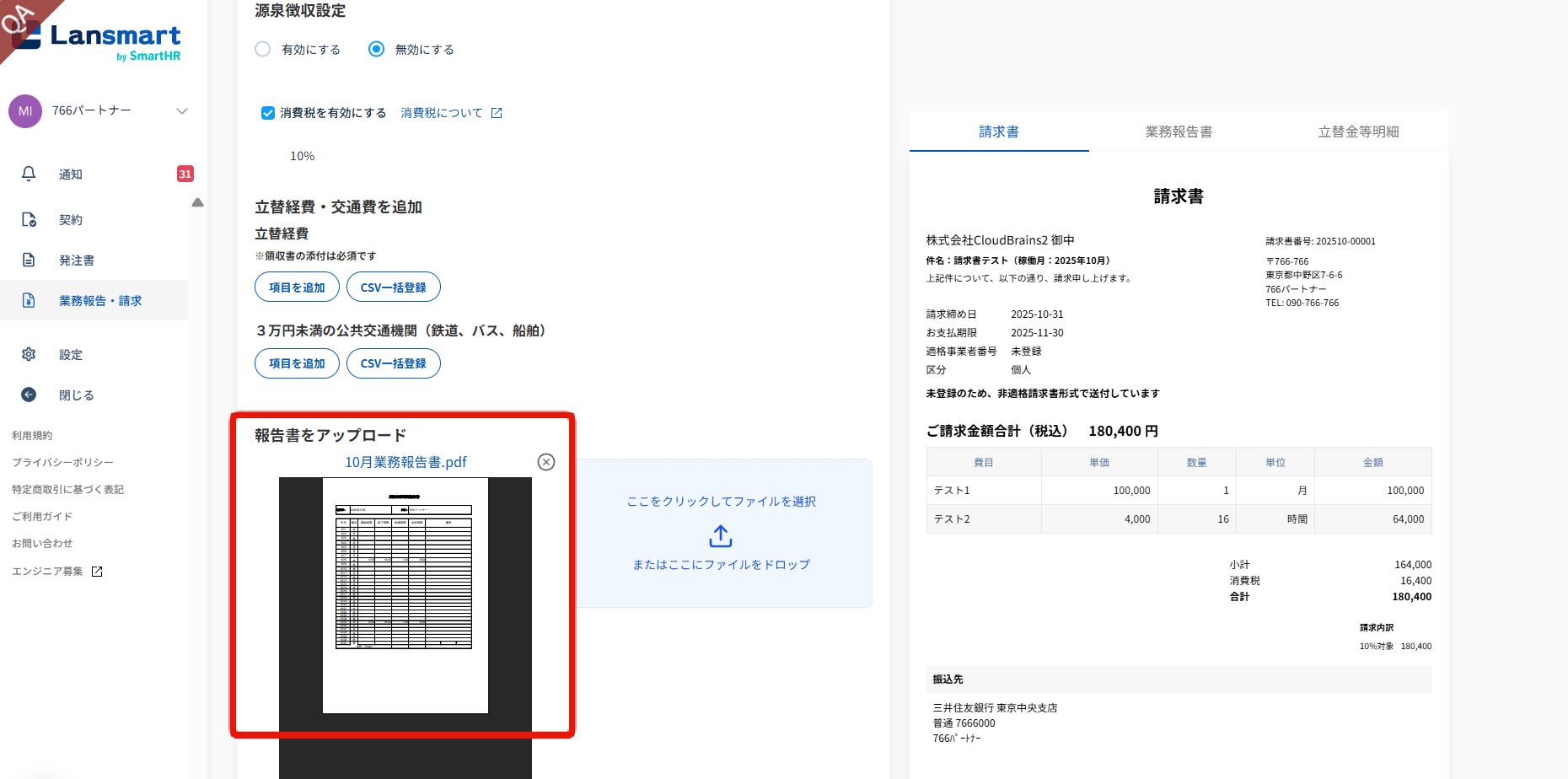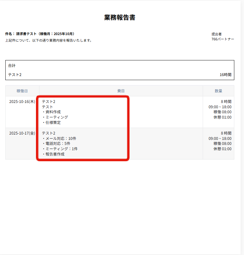 パートナー一覧にてfreee取引先を設定しているパートナーの請求書/支払通知書を業務登録時にPDFの業務報告書をインポートして一括登録した場合、インポートしたPDFが請求書作成画面の報告書をアップロードの箇所に添付されます。 PDFでの一括登録を複数回した場合は、全てのPDFが添付されます。 ※PDFの添付が不要な場合は、請求書作成画面にてファイルの削除をお願いいたします。