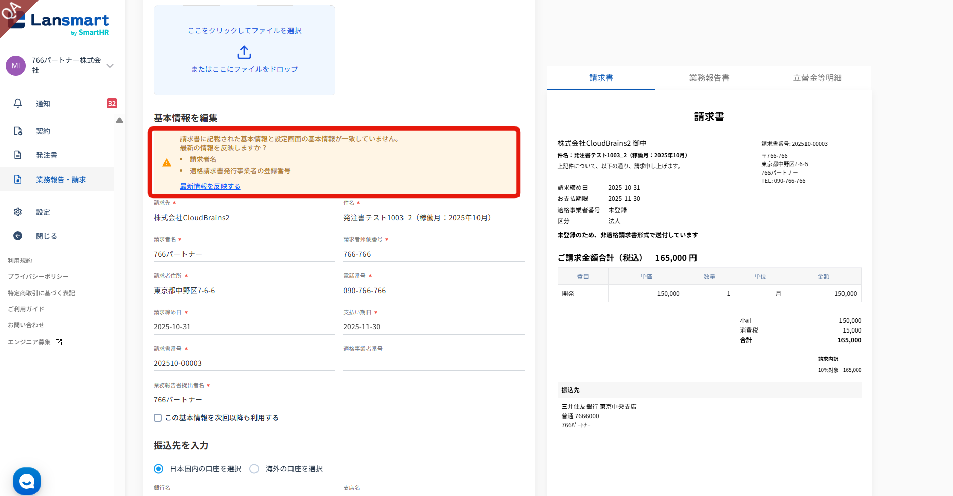 請求書作成画面にて、設定画面の基本情報登録の内容と異なる場合は、アラートが表示されます。