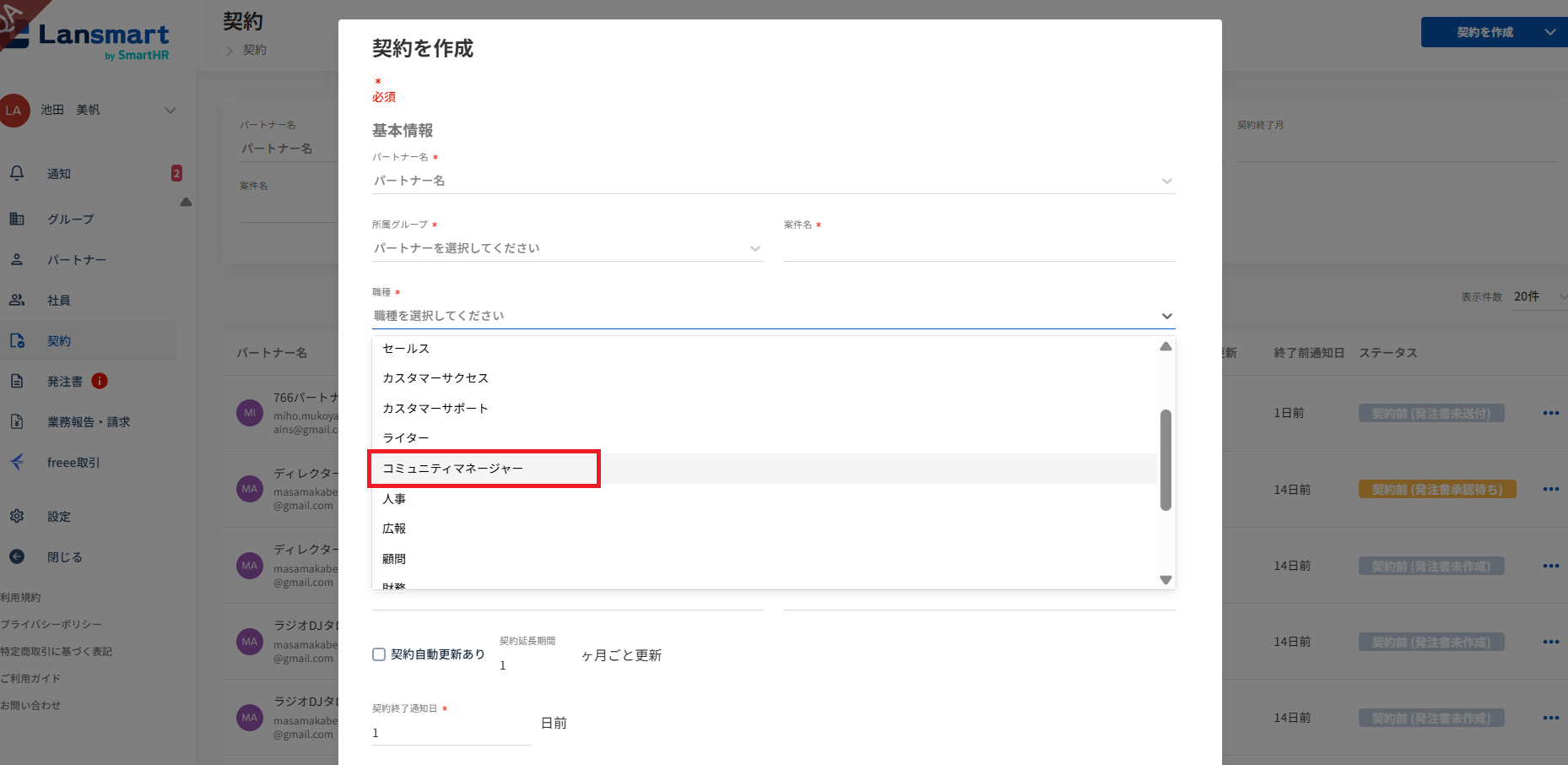 ステータスを「承認済み」にし、稼働月を指定した上で、パートナーの選択をしてください。 パートナーは複数名選択することができます。