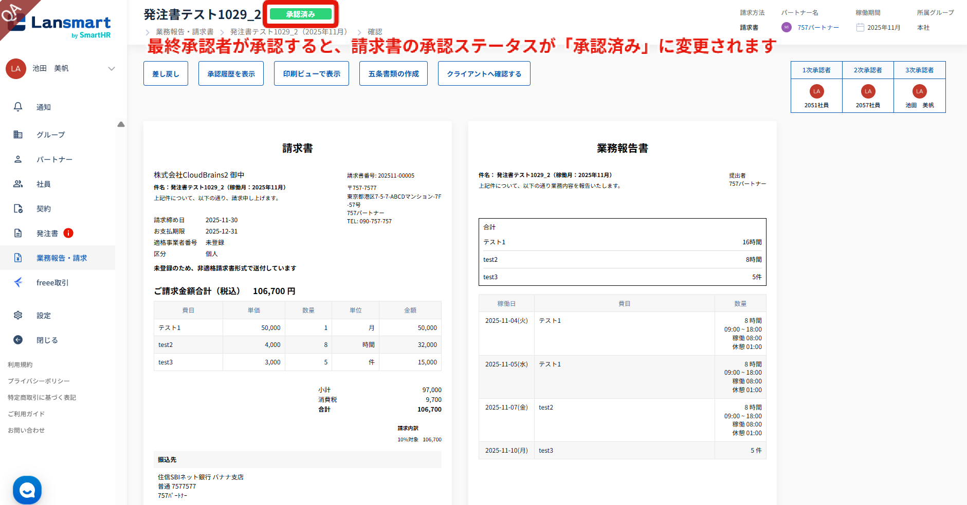 最終承認者が承認すると、請求書の承認ステータスが「承認済み」に変更されます。