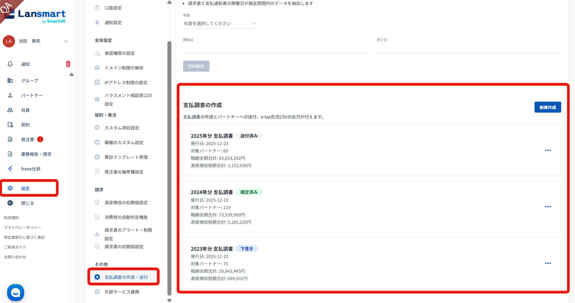 企業様側の左メニュー「設定」→「支払調書の作成・送付」にて、年間の請求書情報(支払金額・源泉徴収額)を元に、対象パートナー様の支払調書を一括作成できる機能です。