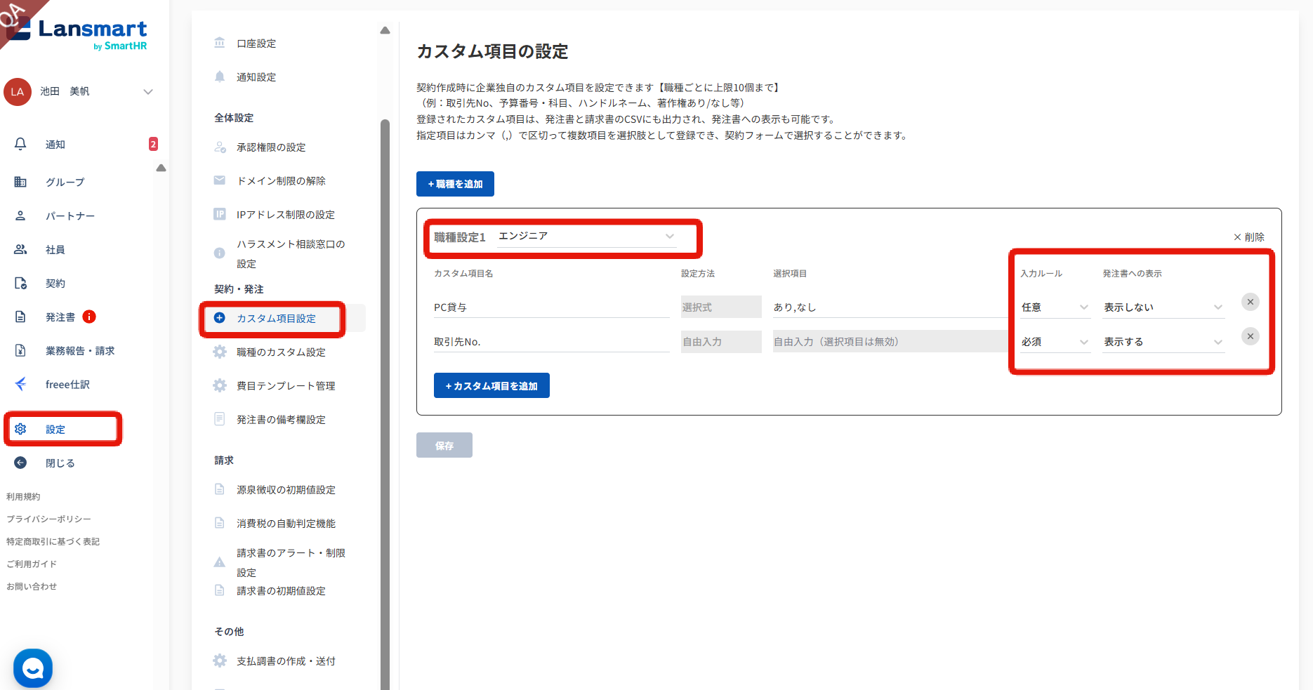 発注書への表示 契約作成時に入力したカスタム項目の情報を発注書に表示するか、表示しないかを設定できます。