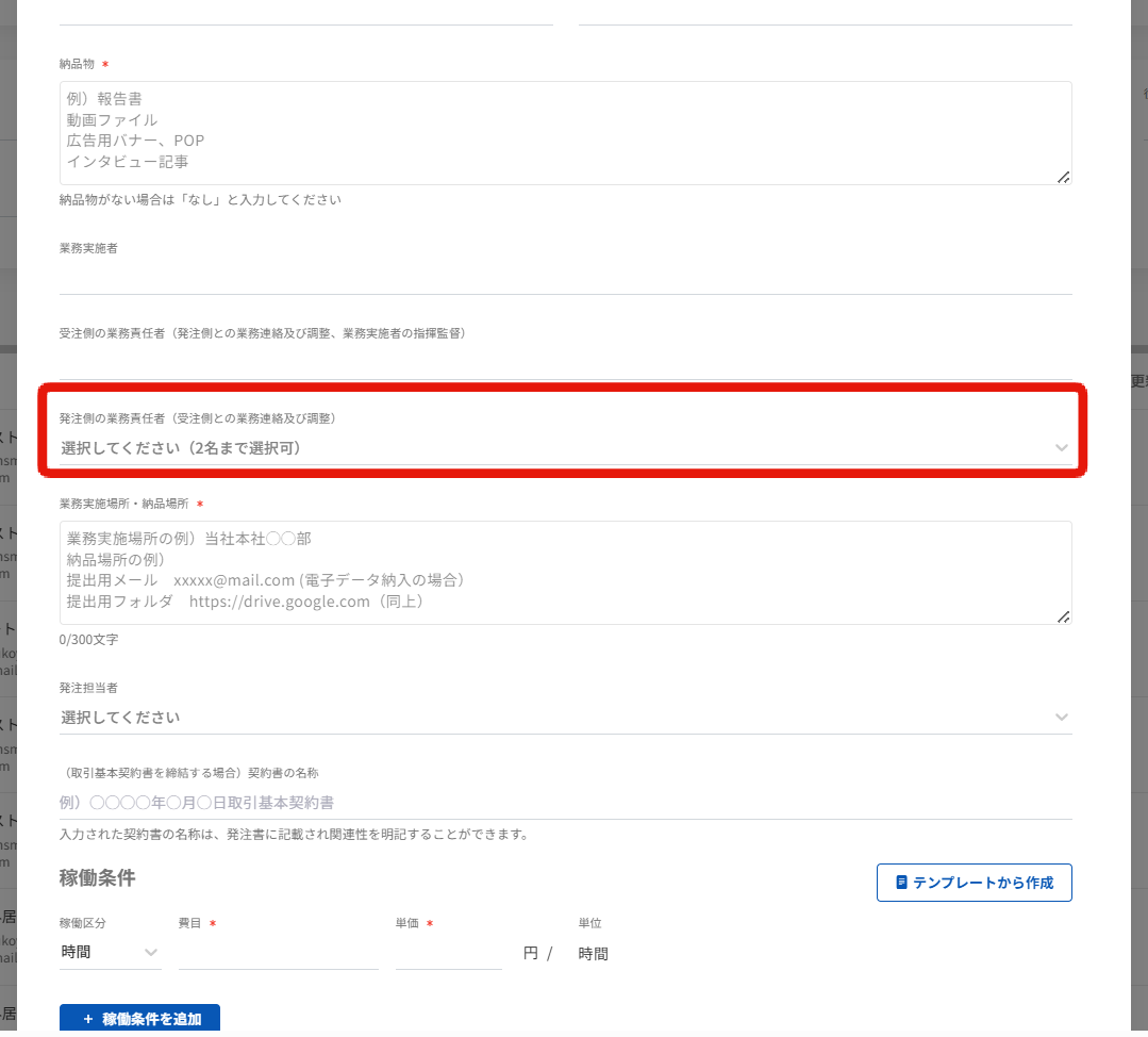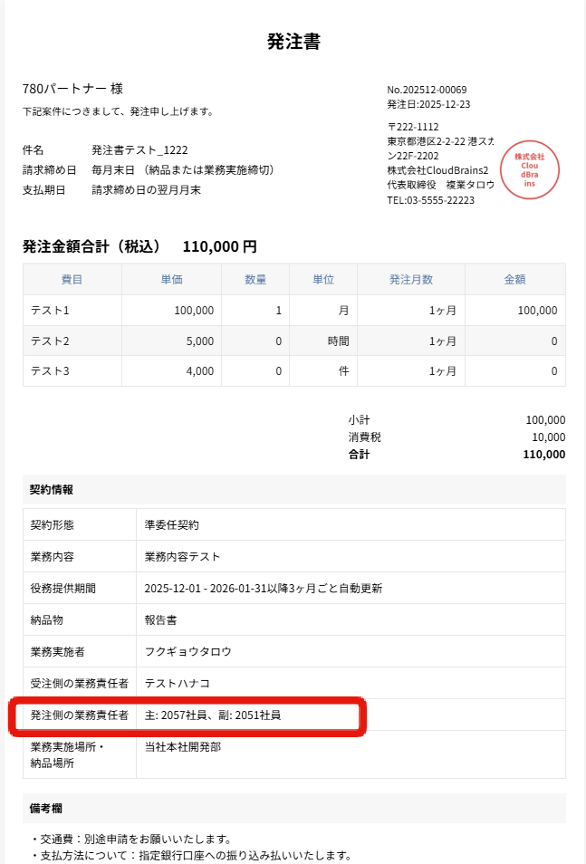 発注書では、一人目に設定した人が主、2人目に設定した人が副と表示されます。