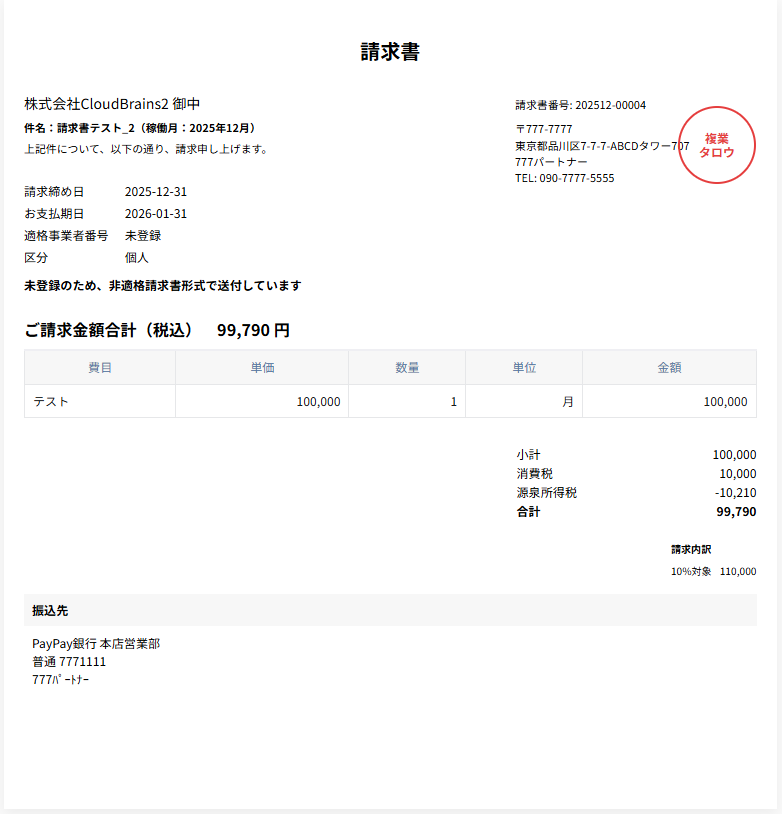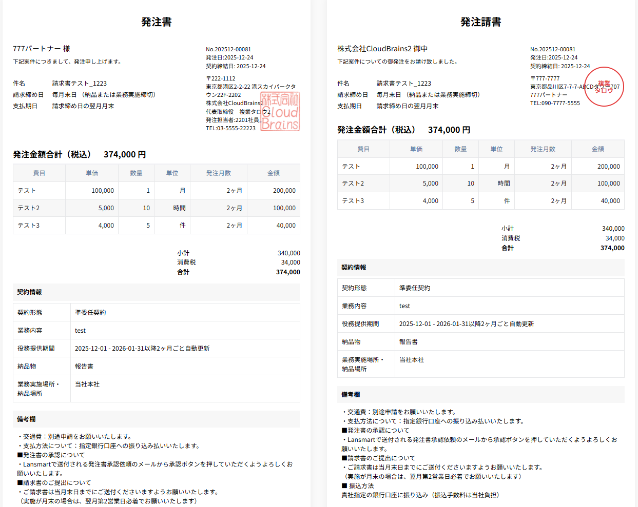 設定した電子印影は、すべての発注請書・請求書に自動的に適用されます。