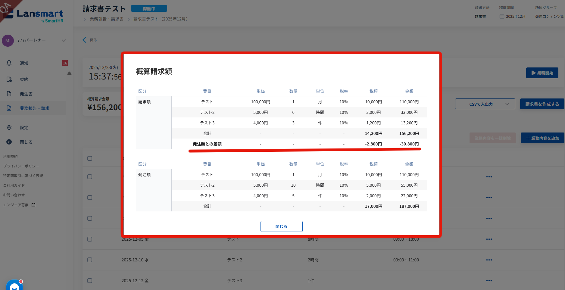 業務報告の画面の概算請求額を確認するモーダルにて、業務登録を行った上で算出される請求額だけでなく、発注時の金額とその差額が確認できるようになりました。