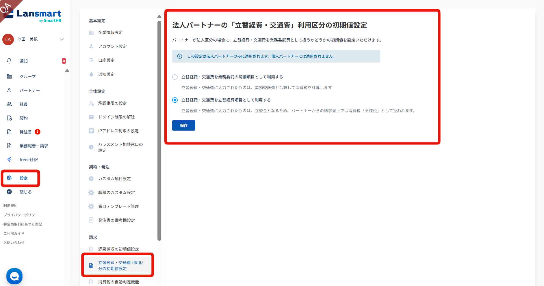 立替経費・交通費を業務委託費として扱いたい場合は、「立替経費・交通費を業務委託費の明細項目として利用する」を選択し、「保存」ボタンを押してください。
