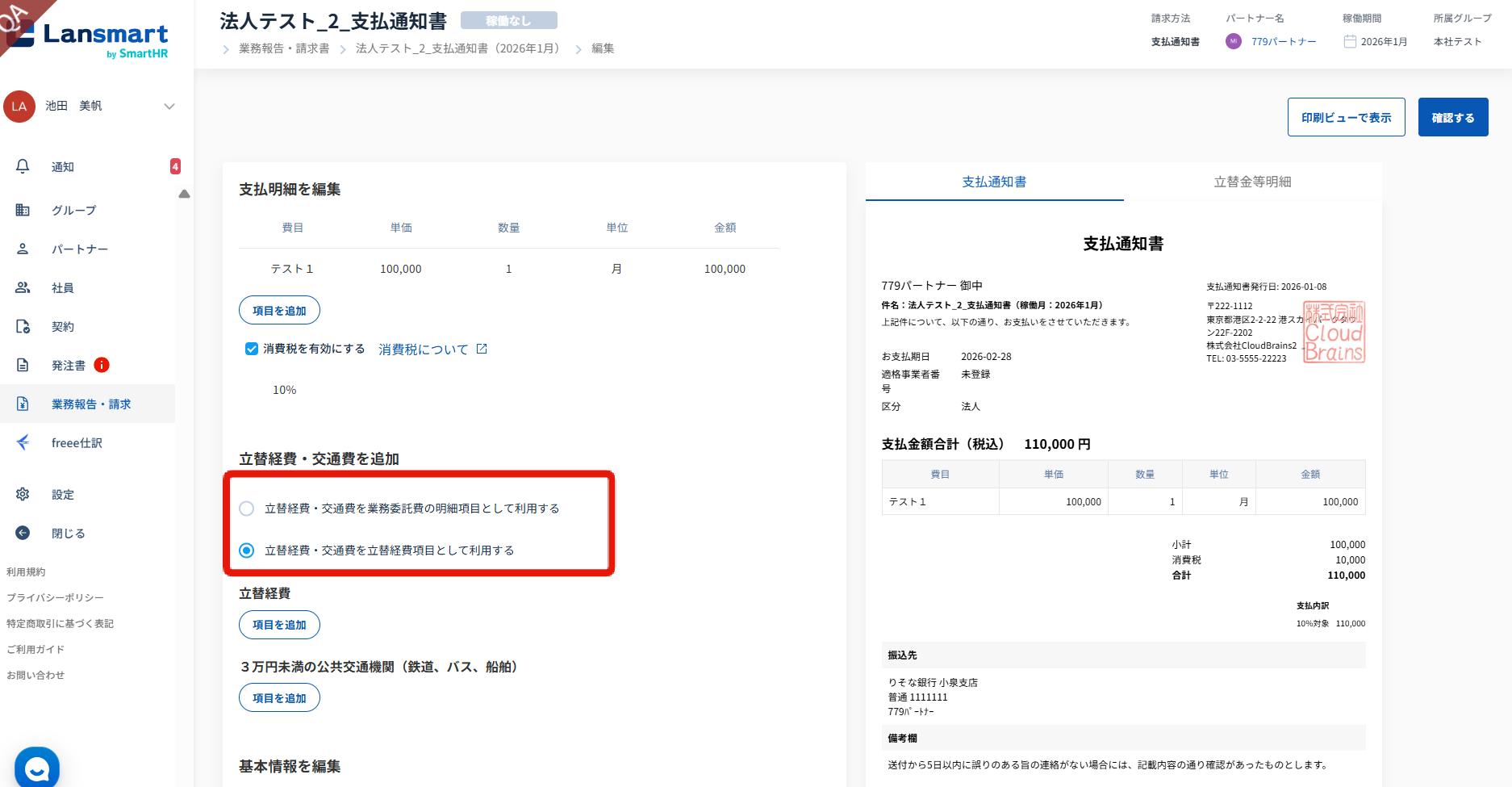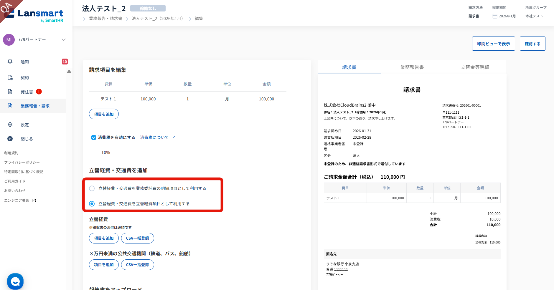 法人パートナーの請求書作成画面